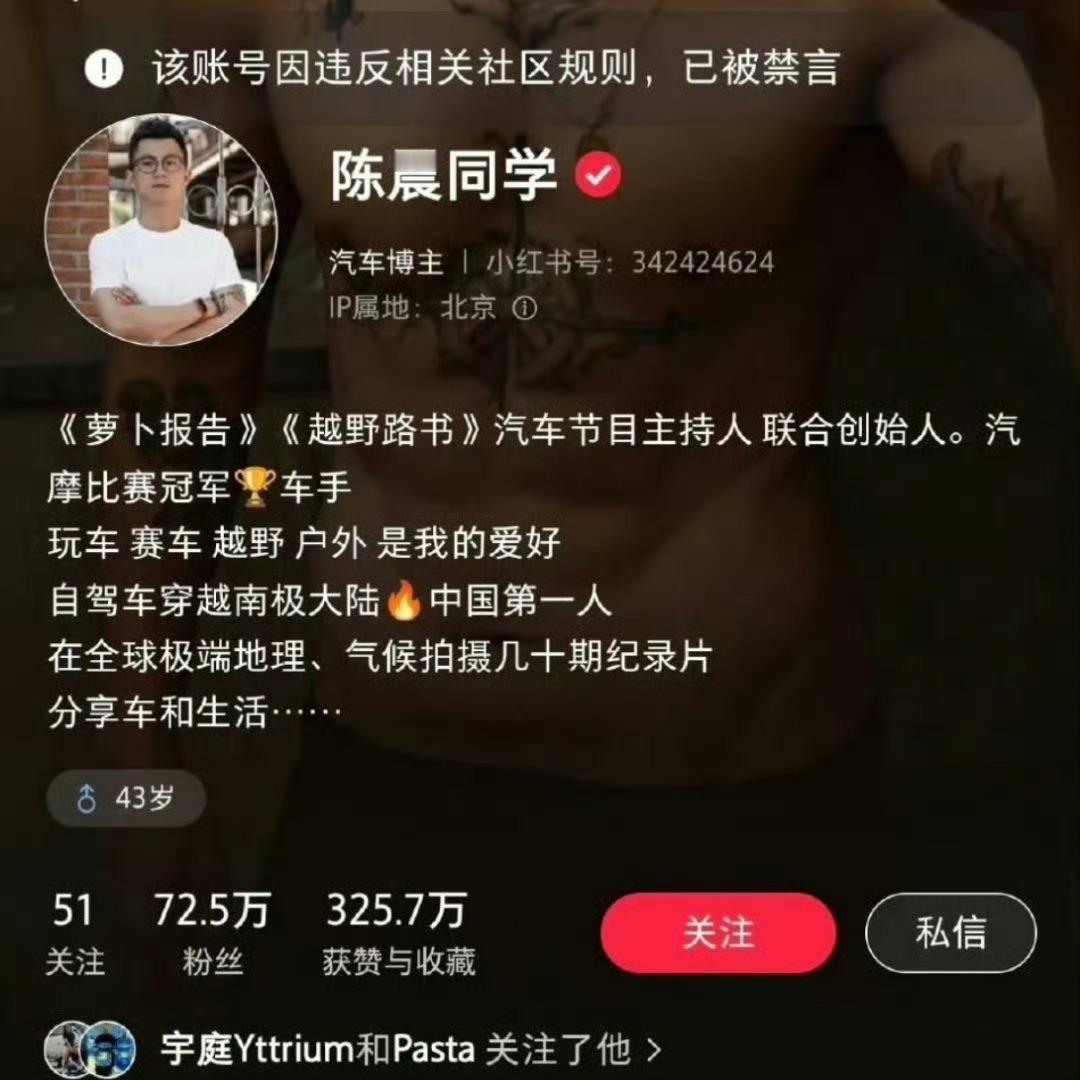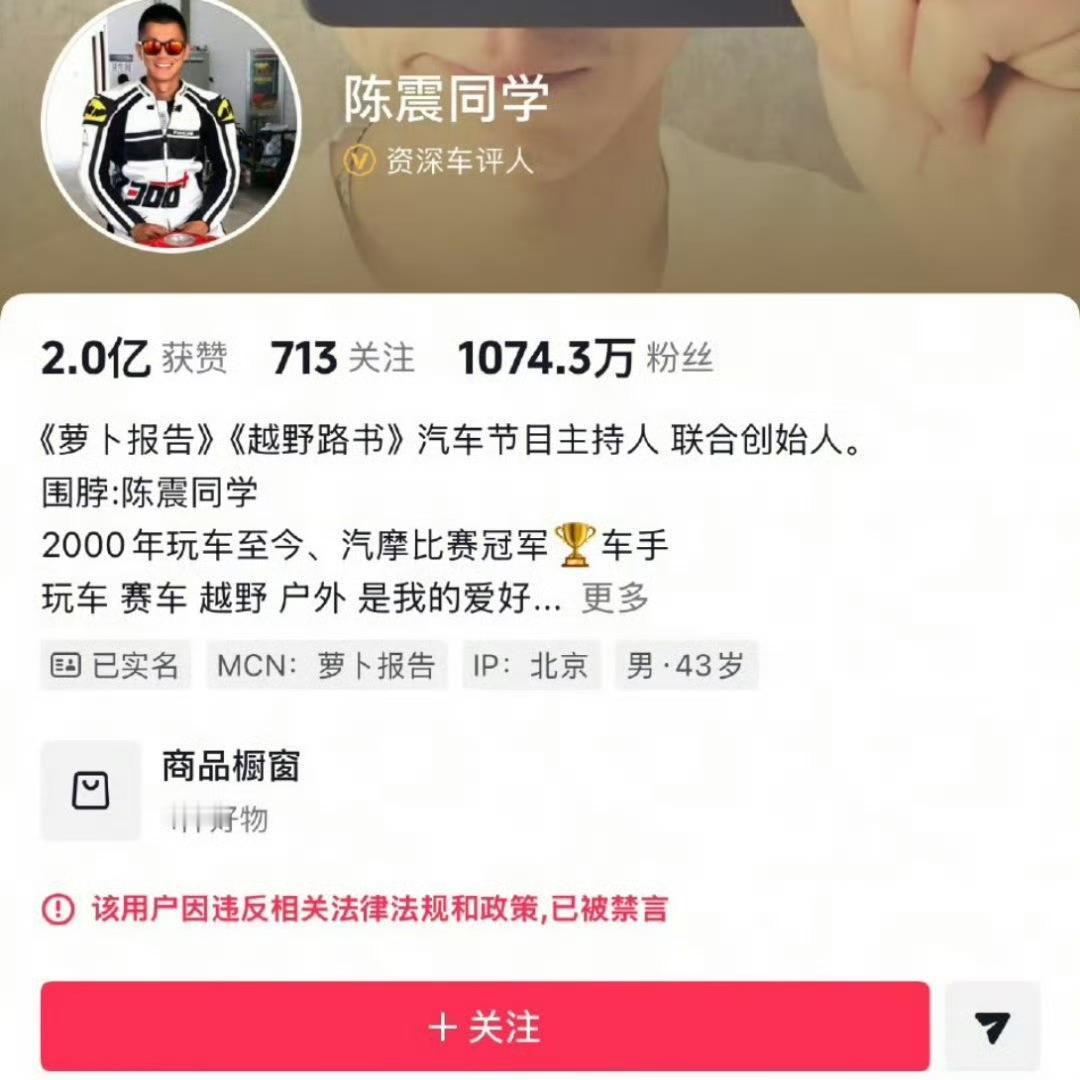 陈震在微博、抖音、小红书、B站被全面禁言。 其实这些网红都不应该被吹捧,他们不像成龙不像韩红,人家是靠实力被各界认可的,网络上的红人,只是看粉丝数,这个确实应该被治理一下了,要不有些人确实特别嚣张,离开网络,他们啥也不是。