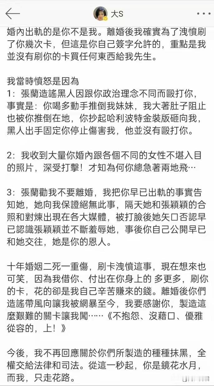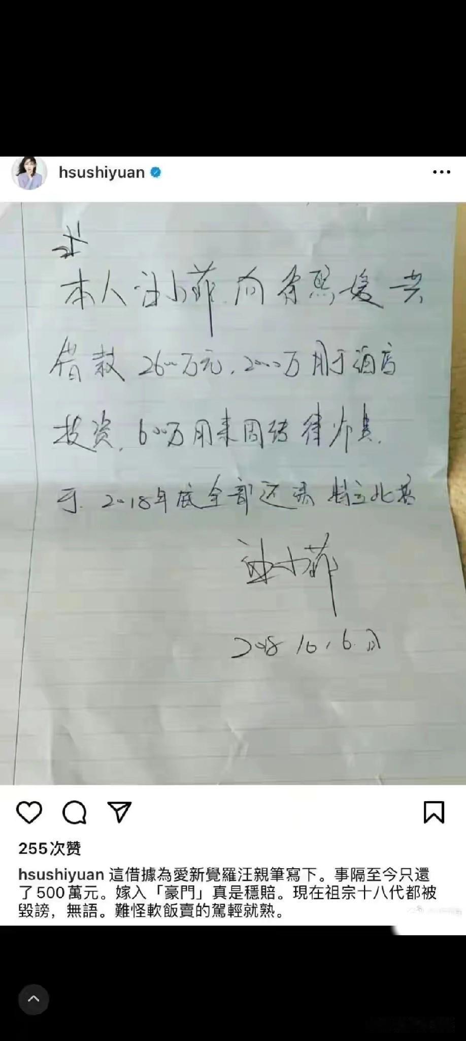 有个事 大家不觉得奇怪么 有人说 大S十年花了汪家十个小目标 可奇怪的是 前婆婆撕了她四年 只字没提过S花她钱的情况 只是拿每家都可能 有的婆媳之间的那点矛盾 一说再说 反倒是大S晒了一份 汪公子给她打的欠.条 所以他们俩家 到底是谁欠谁的钱呢 难不成真如大S说的 刷的汪滴卡却都是她 辛苦赚来的钱