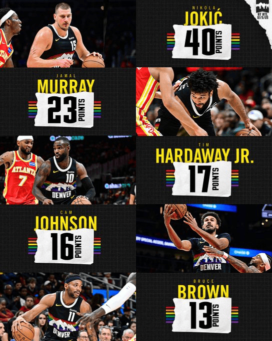 本场比赛,约基奇拿下40分,默里拿下23分,卡梅伦-约翰逊拿下16分,小蒂姆-哈达威拿下17分,布鲁斯-布朗拿下12分。