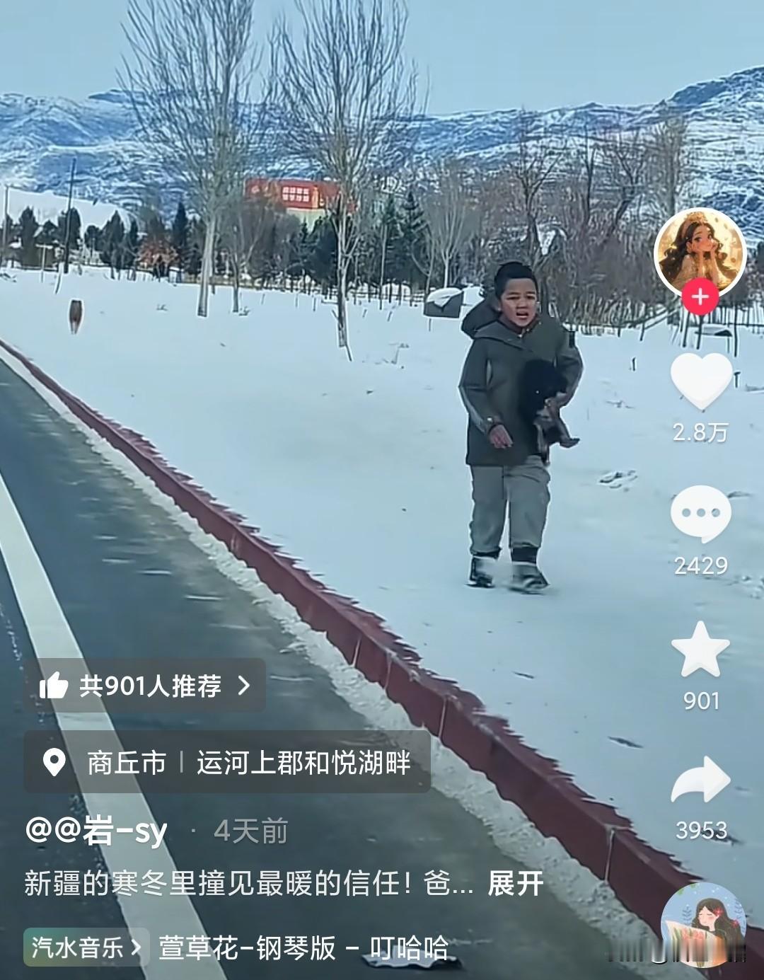 “太有灵性了!”狗会把自己养不活的崽,送给人类,鼻子一直顶着小狗,让它往人那边走。 东北的大冬天,流浪猫狗如果没有家,很容易被冻死,在一片遍地白雪覆盖的路上,一只狗突然截停一辆白车,把那只黑色的小狗带到车主人旁,使劲摇着尾巴,还用嘴顶了顶小狗,让它走过去。 狗妈妈要走了,小狗还跟过去,期间狗妈妈三步一回头,车主很快就明白了它的意思,上去把追狗妈妈的小狗给抱住,表示愿意收养,狗妈妈最后看了一眼,直接走了。 它好相信人类,看这位车主,车前还挂着红旗,一看就知道是一位爱国善良的人士,狗妈妈看人的眼光不错。