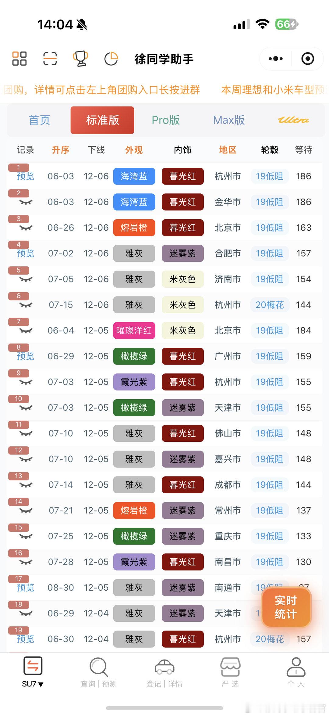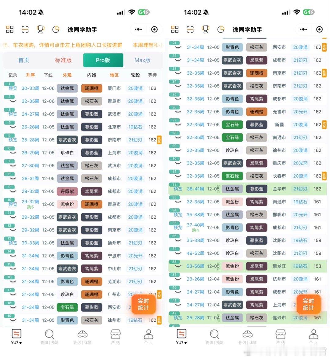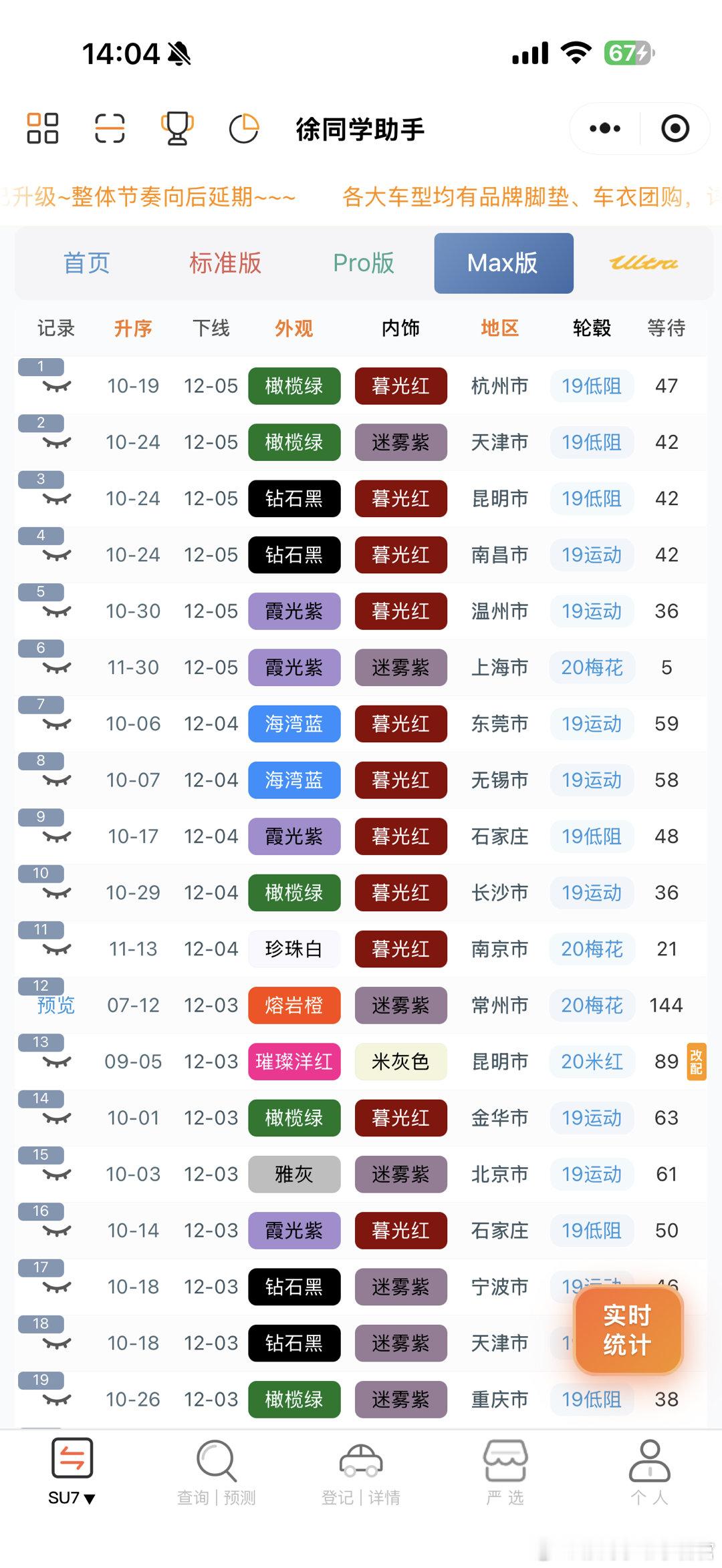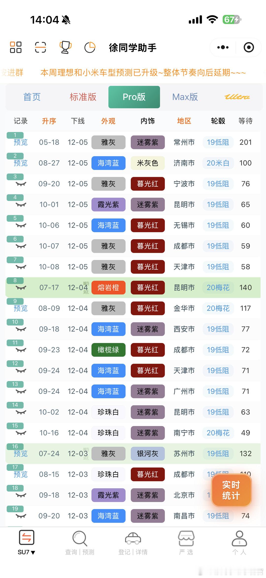 小米汽车(12月5日)下线实况昨天看到有初始61周的标准版下线了但是,还有不少1-4的没有下线(专门查了一下,工信部这批公告里没看到小米的新车,得等下一批了)🌀YU7(据不完全统计)合计166台1️⃣标准:下线82台,有一部分1-4的还没下,但是30周以后的也在正常下线,现在订单有点混乱的2️⃣Pro:下线36台,稀有色来了一大批,稀有色下线也很快3️⃣Max:下线48台,基本都是30周之后的,现车也还有,但是配置太奇葩了(比如19轮毂➕运动套件)🌀SU7(据不完全统计)合计24台1️⃣标准:下线11台,很少了,后面的订单也非常稀少,最近也没什么产能了2️⃣Pro:下线7台,真的没别没产能了3️⃣Max:下线6,没几台车4️⃣ultra:无更多关于小米汽车的最新资讯和深度解析,请参考【米车派】~徐同学助手小米汽车