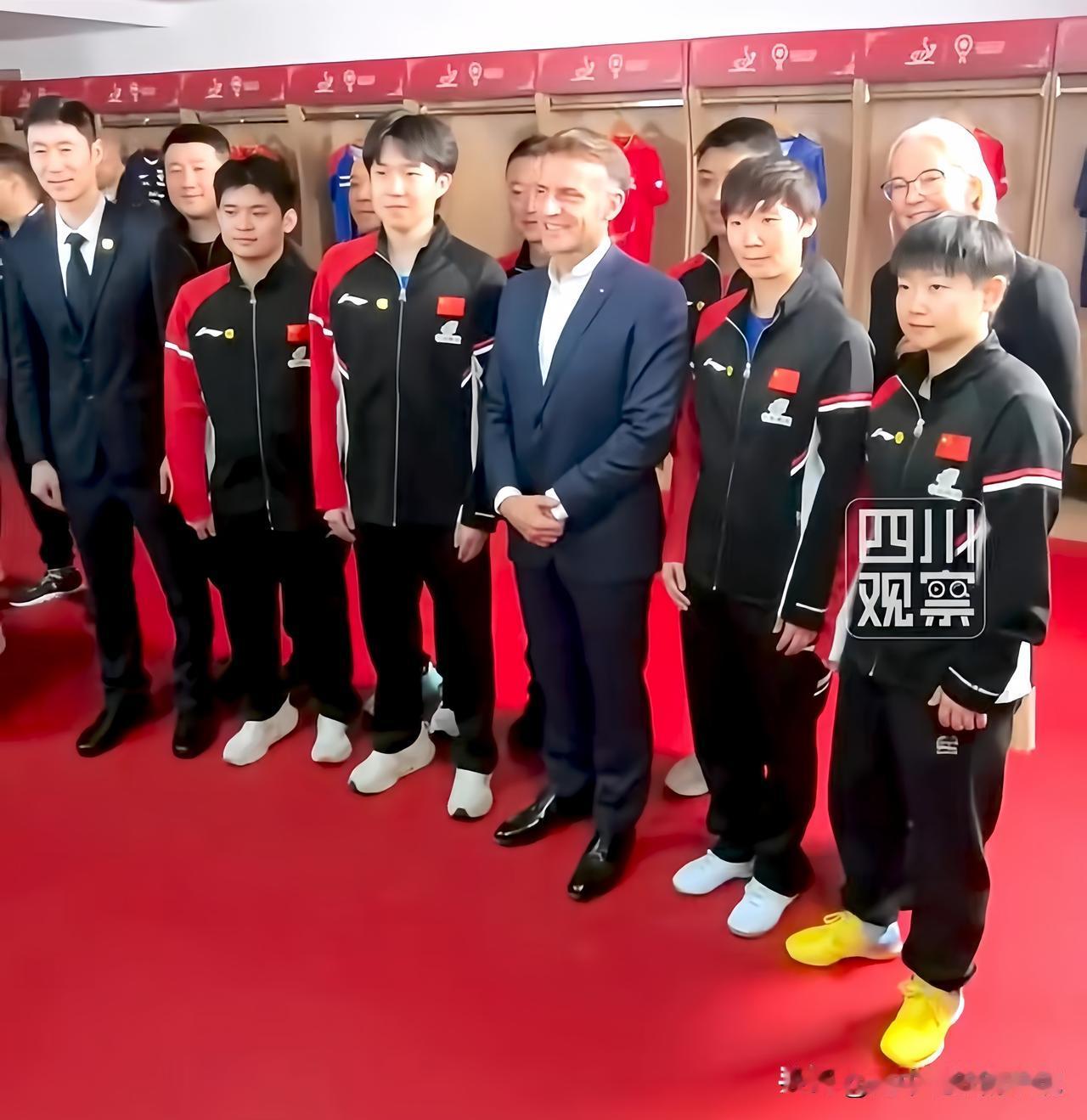 梦幻联动! 马克龙点名孙颖莎打混双,王楚钦火速就位,友谊赛甜度超标。 成都混团世界杯现场直接嗨翻! 法国总统马克龙当着全场的面,用中文喊“莎莎”点名要打混双,王楚钦立马凑过来搭档,这场跨界对决简直燃爆了! 马克龙穿西装挥拍超带劲,孙颖莎和王楚钦特意放慢节奏配合,每一拍都充满欢声笑语。别看是即兴友谊赛,他居然清楚孙颖莎拿过不少世界冠军,妥妥的国乒粉丝无疑了。 小球转动大友谊,这场互动比啥都暖心。不管身份多特别,在热爱面前都是普通人,国球这波体育外交,真的太有感染力了! 马克龙点名孙颖莎打混双 莎头组合名场面 中法乒乓友谊暖瞬间