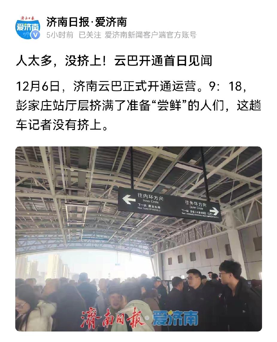 怪不得要前一天悄悄的发布信息,济南云巴运营第一天就被挤爆了,乘客排队一直排到人行道上。 这些人有的是尝鲜的,有的是真的通勤。特别是地铁二号线终点站彭家庄站,做完地铁还要转车去孙村片区的人也不少呢。 也不知道云巴以后会不会很挤,如果天天这样可麻烦了,说明客流需求很大,那就应该建轻轨而不是云巴。 云巴车的速度并不慢,最高时速能跑到80公里每小时。但云巴的站点太多了,有32站。所以云巴跑完全程(31公里)刚好一个小时。不过比公交车快多了,一般公交车30多个站运营时间得两个半小时。 值得一提的是云巴车辆比较晃荡,给人一种坐过山车的感觉。容易晕车的人不建议尝试了。