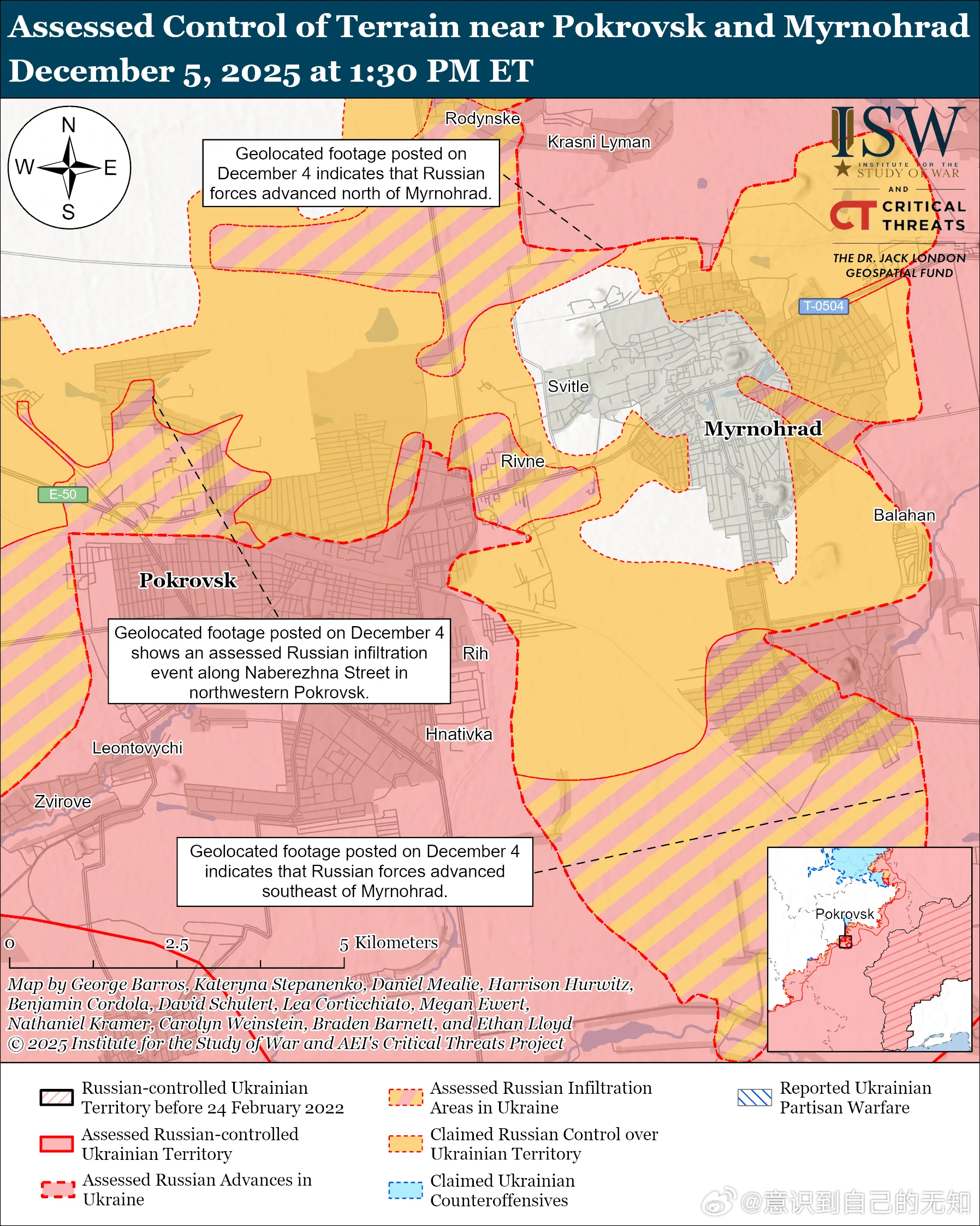 公开信息显示截至 12 月 5 日,俄军尚未包围米尔诺赫拉德的乌克兰军队,俄军仍在努力完成对波克罗夫斯克-米尔诺赫拉德包围圈的包围。 12月4日公布的地理定位视频显示,俄军近期向米尔诺赫拉德(波克罗夫斯克以东)北部和东南部推进。12月4日公布的其他地理定位视频还显示,俄军已渗透到波克罗夫斯克西北部的阵地。然而,这些地理定位信息尚不足以断定俄军已在波克罗夫斯克-米尔诺赫拉德包围圈内完全包围乌克兰军队。乌克兰空降突击部队第7快速反应军司令叶夫根·拉西丘克准将于12月5日报告称,俄军尚未包围波克罗夫斯克-米尔诺赫拉德,乌克兰军队控制着波克罗夫斯克北部,并在波克罗夫斯克中部保持阵地。拉西丘克指出,俄军正在避免城市巷战,而是试图从波克罗夫斯克侧翼绕过该城。ISW继续评估认为,俄军很可能完成包围。经过 21 个月的战役,俄军仍然试图占领了波克罗夫斯克和米尔诺赫拉德,但目前完成占领的时间和作战影响仍不清楚。虽然 ISW 没有观察到视觉证据或乌克兰官方报告来评估俄军是否已包围米尔诺赫拉德的乌克兰军队,但局势可能极其艰难,俄军很可能使用火炮和无人机破坏乌克兰狭窄的撤离路线和地面交通线 (GLOC)。