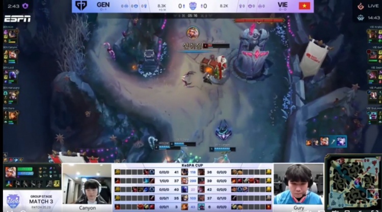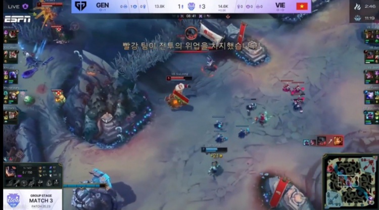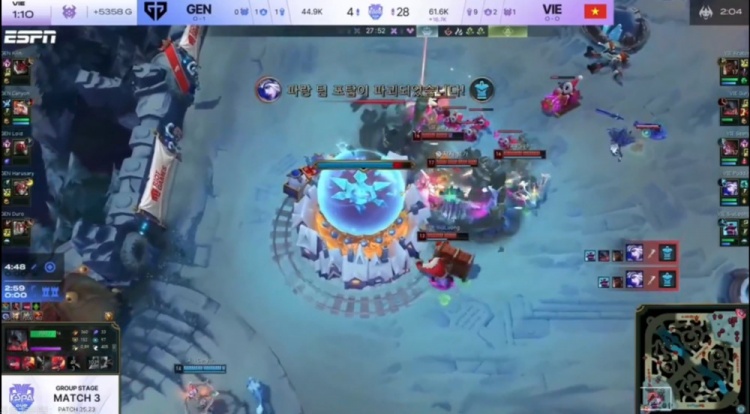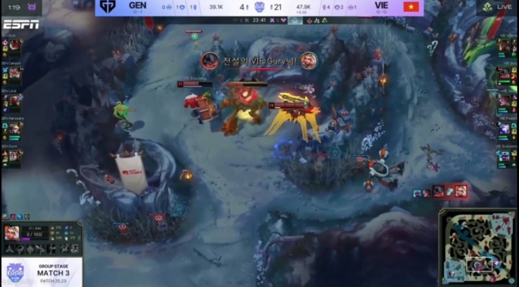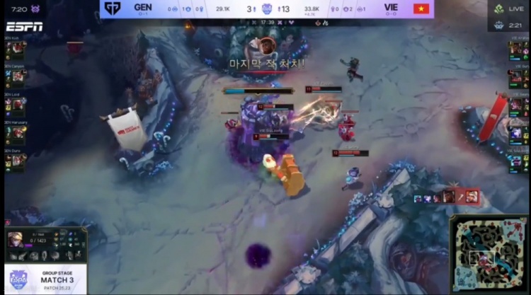[11:32]Canyon绕后gank配合Kiin兰博击杀Kratos奎桑提,但是下路组对线GEN双人都被打残,VIE拿下小龙之后Seany阿萝拉罩大留人,VIE追到了下二塔,最终再打出一波1换3!