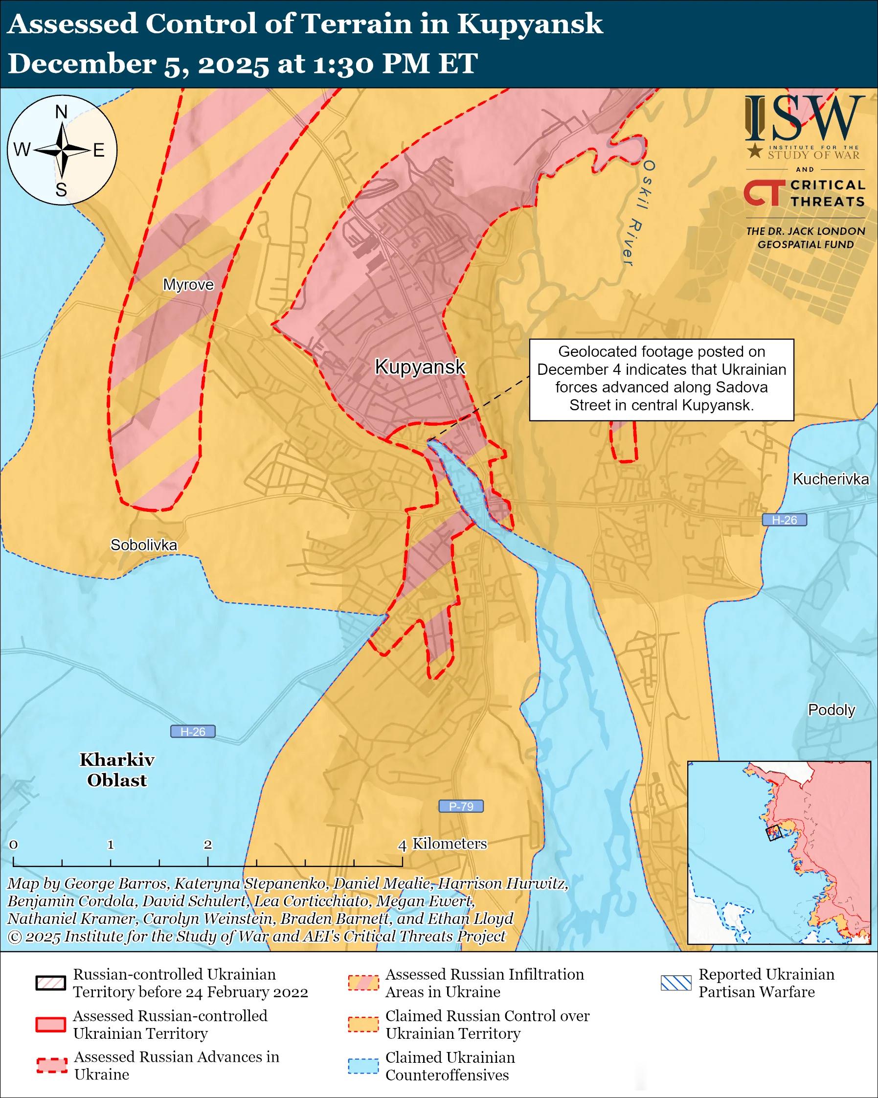 俄军主要行动2俄军目标:占领卢甘斯克州剩余部分,向西推进至哈尔科夫州东部,并包围顿涅茨克州北部。12月5日俄军继续向库皮扬斯克方向发起进攻,但并未取得进展。评估乌克兰的进展:12 月 2 日发布的地理定位视频显示,乌克兰军队在库皮扬斯克中部取得了进展。12月4日和5日,俄军在库皮扬斯克附近以及库皮扬斯克东南方向的皮什恰内、斯捷波娃、新谢利夫卡和赫卢什基夫卡等地发动进攻。一位俄罗斯军事博主声称,乌克兰军队在库皮扬斯克西郊进行了反击。战斗序列:据报道俄近卫第1坦克集团军(莫斯科军区)的多管火箭炮系统(MLRS)部队正在库皮扬斯克方向打击乌克兰阵地。俄军最近向博罗瓦方向推进。评估俄军的进展:12 月 4 日发布的地理定位视频显示,俄军在博胡斯拉夫卡南部(博罗瓦以北)取得了进展。未经证实的说法:一位俄罗斯军事博主声称,俄军向博胡斯拉夫卡东部和南部推进。12月4日和5日,俄军从博罗瓦北部向诺沃普拉托尼夫卡方向进攻,并向博罗瓦东南部的赫雷基夫卡、诺沃耶霍里夫卡和诺沃沃迪亚内附近进攻。12月5日俄军继续在斯拉维扬斯克-利曼方向发动进攻,但并未取得进展。未经证实的说法:12月5日在斯拉维扬斯克-利曼方向作战的乌军旅发言人报告称,乌克兰军队控制着新谢利夫卡(利曼西北部)和斯塔夫基(利曼北部)。该发言人指出,俄军在渗透任务中升旗,以夸大其在战场上的推进——这与ISW持续的评估一致,即俄军指挥部正在前线各地炫耀性地升旗,以支持其夸大的俄军推进说法,这是认知战的一部分,旨在将俄军的战场胜利描绘成不可避免的。12月4日和5日,俄军在莱曼西北部的德罗比舍韦、德里洛夫和尚德里霍洛夫附近以及奥列克桑德里夫卡方向发动进攻;在莱曼东北部的科洛迪亚齐附近发动进攻;在莱曼东部的扎里奇涅附近发动进攻。乌克兰第三军发言人奥列克桑德·博罗金于12月4日报告称,俄军正在加强斯拉维扬斯克-利曼方向的进攻行动,并部署雇佣兵,其中包括来自非洲国家的雇佣兵。博罗金报告称,俄军不再频繁使用光纤无人机,但俄军无人机行动扩大了杀伤区(即紧邻前线的区域,大量战术打击和侦察无人机在该区域活动,对任何进入该区域的装备或人员构成高度威胁),使乌克兰的后勤保障更加复杂。一名在斯拉维扬斯克-利曼方向作战的乌克兰旅军官报告称,俄军正利用雾气掩护,以五至七人为一组推进。该军官表示,俄军已向斯拉维扬斯克-利曼方向部署了两支精锐无人机部队,进一步加剧了乌克兰在该地区的后勤保障难度。作战序列:据报道俄第144摩步师(第20合成集团军[CAA],MMD)的电子战(EW)部队正在莱曼方向拦截乌克兰无人机。第73炮兵旅(第25合成集团军[CAA],中央军区[CMD])的炮兵部队正在莱曼方向作战。