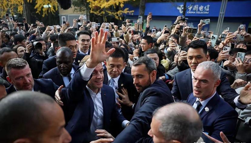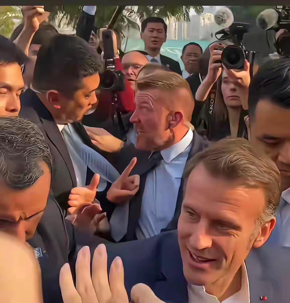 非常搞笑的一幕!马克龙到四川大学访问,道路两边的学生夹道欢迎,非常热情,马克龙激动的跟大学生打招呼,前面热情似火❤️🔥,后面中法保镖差点动起了手,法国保镖质疑为什么这么多人,中国保镖让他放心好了总统是绝对安全的。两个人面红耳赤的争持起来,各说各话反正都听不懂,法国保镖气的不轻,晚上多吃点中国美食消消气也压压惊。法国马克龙