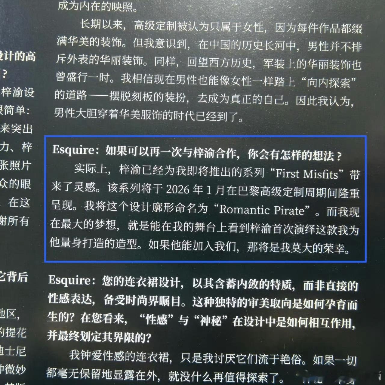 梓渝获2026巴黎时装周邀请👑StevenPassaro&Julien Fournié两个高定品牌对新顶流梓渝真是又争又抢,《时尚先生》合作接触后就先后成为了他们的“灵感MUSE”。💎StevenPassaro高定设计师已经亲自向梓渝发出邀请,期望他能携带最新季品牌高定亮相2026巴黎时装周。🔮高定Julien Fournié设计师及创始人采访提及:即将推出的系列“First Misfits” ,梓渝为其带来了灵感。该系列将于2026年1月在巴黎高级定制周期间隆重呈现。而现在最大的梦想,就是能在我的舞台上看到梓渝首次演绎这款我为他量身打造的造型。🔥爆火半年时尚成绩已经到了不能复刻的程度,现在更成为了别口中高冷高定的灵感MUSE,就是这个梓渝好🐮啊!