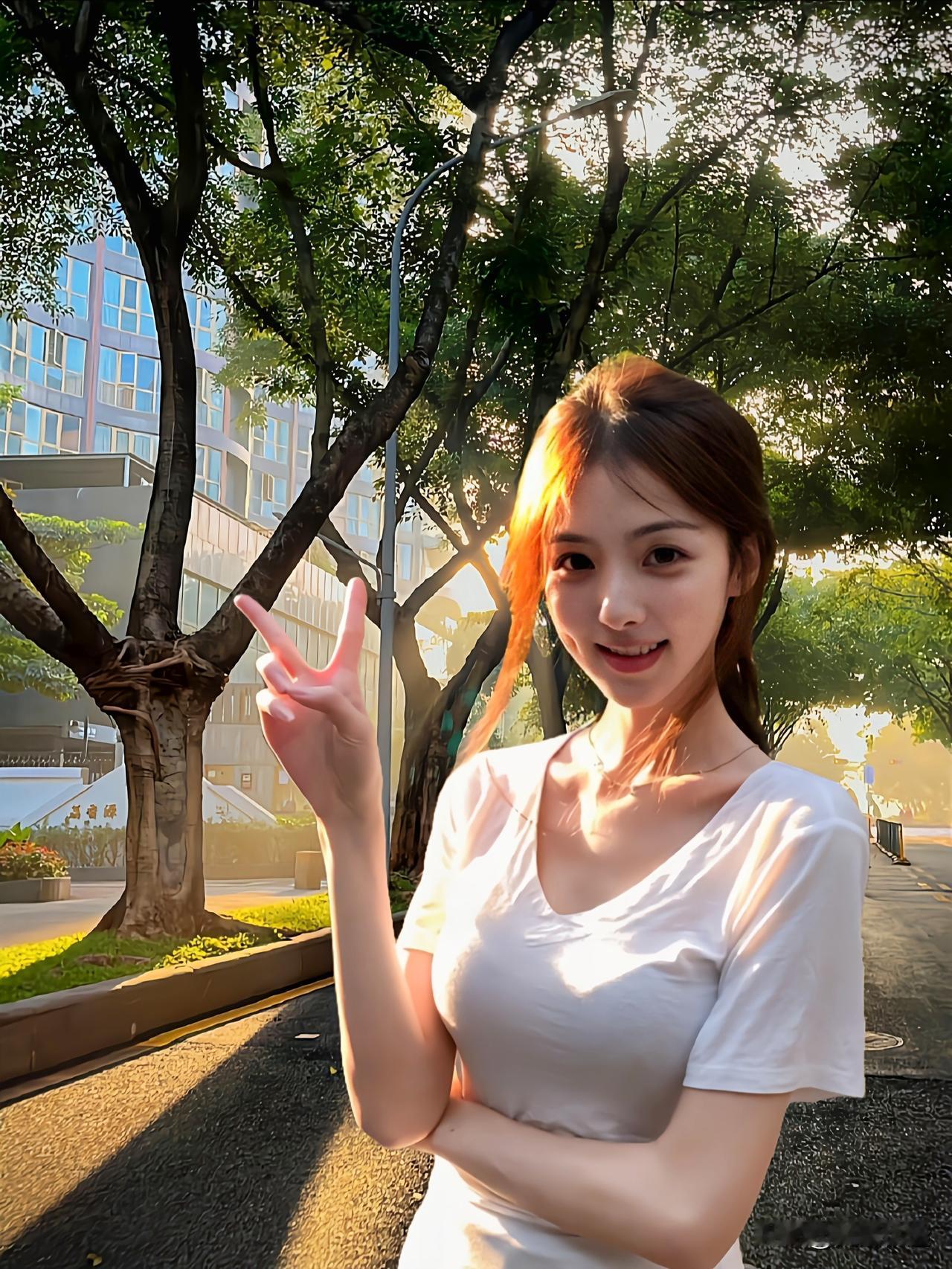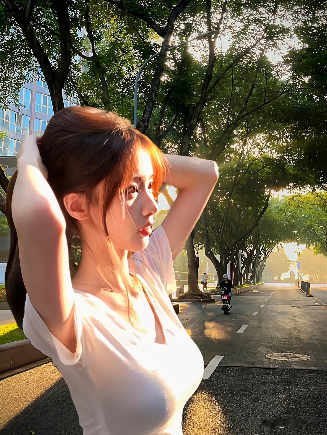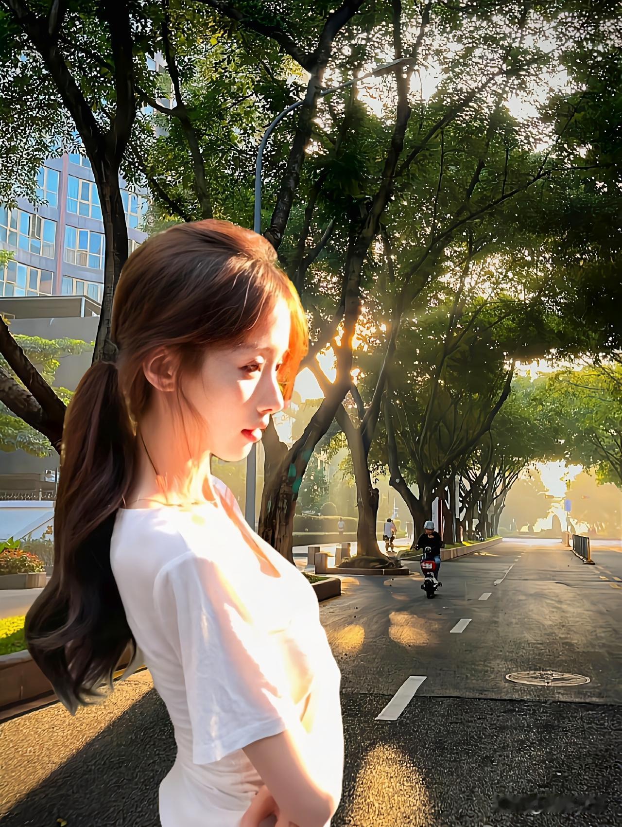 阳光洒落,少女漫步在树荫下,静谧而美好。