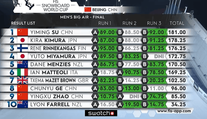 值得一提的是,在早前的大跳台世界杯云顶站单板滑雪男子决赛中,苏翊鸣以总分174.50分夺得本赛季金牌,获得本赛季大跳台的两连冠!