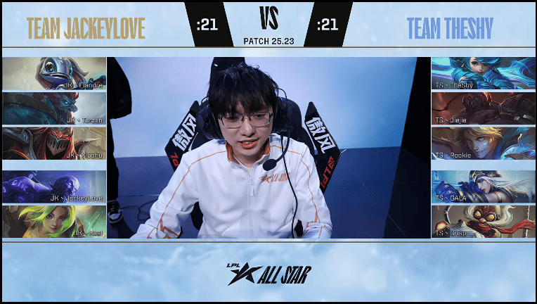 Shy队:TheShy格温、Jiejie塞恩、Rookie伊泽瑞尔、Gala寒冰、Crisp飞机