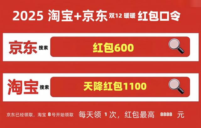 2025双十二购物狂欢来了!690亿国补余量告急,广东、江苏等大省额度即将耗尽,年度最优省钱时机仅剩最后几天!淘宝、京东双平台简化规则、加码福利,淘宝“直降12%起+国补”无需凑单,京东“跨店满减+国补+红包”三重叠加,数码家电、服饰美妆等热门品类最高立减2000元。12月6日预热开启,8日正式开卖,现在淘宝搜「天降红包1100」领最高8888元红包,京东搜「红包600」抢1888元无门槛福利,再锁「家电588」「数码588」国补资格。7天价保+价保核验护航,叠加会员特权与以旧换新最高省35%,错过再等一年,赶紧行动锁定年末最优价!