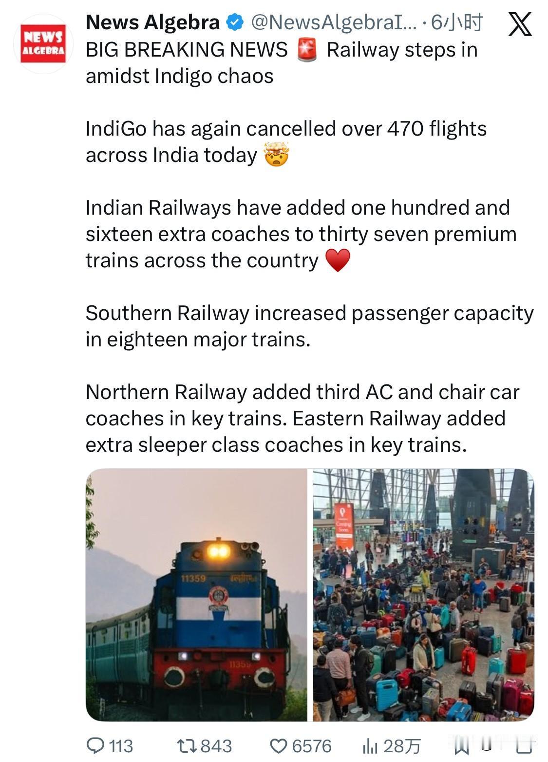 印度靛蓝航空今天再次取消了印度境内超过470个航班。 与此同时,印度铁路在全国37列高级列车上增加了116节车厢。 南方铁路公司增加了十八趟主要列车的运力。 北方铁路在重点列车上增设了第三节空调车厢和普通座椅车厢。东部铁路在重点列车上增设了卧铺车厢。