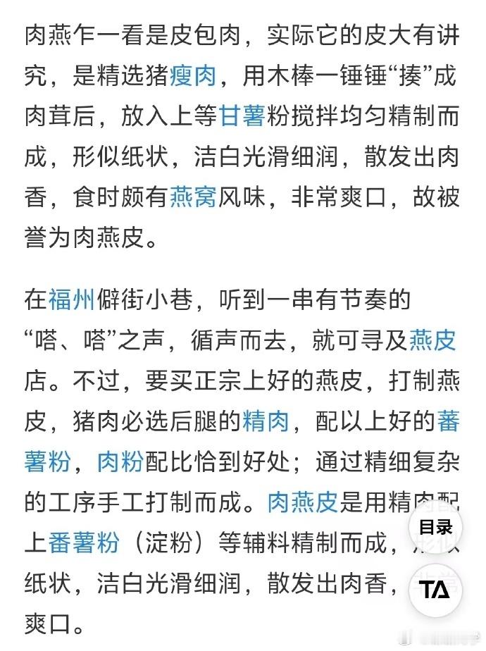 福州肉燕的燕是什么这不是纸是薄到透光的肉片谁懂啊!三坊七巷的肉燕燕皮真的薄到能透光,比纸还纤薄,却是实打实的猪肉捶打而成~ 咬下去弹韧多汁,非遗手艺果然名不虚传,来福州必吃的美味!