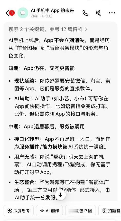 豆包则给出了“短期共存、中期转型、长期融合”的判断。它表示,App不会消失,而是从“独立应用”演变为“AI可调用的服务组件”,最终目标是让用户“只提需求,不问工具”。