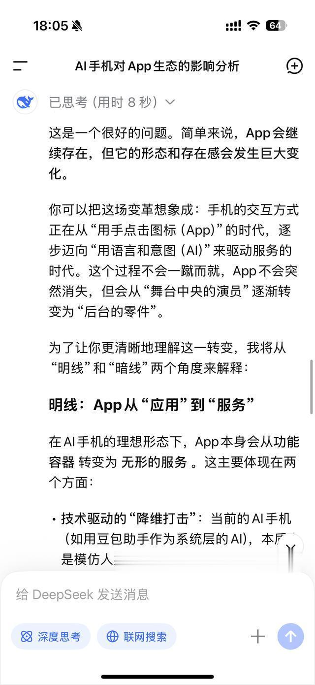 DeepSeek认为,未来App的走向会是分化的。工具型App会“后台化”;超级App会与AI深度博弈/融合;专业/创意/娱乐App会“AI增强化”。总而言之,AI手机不会让App“消失”,而是会重塑整个应用生态的形态和入口。未来,你或许不再需要“打开App”,但App提供的核心服务将无处不在。