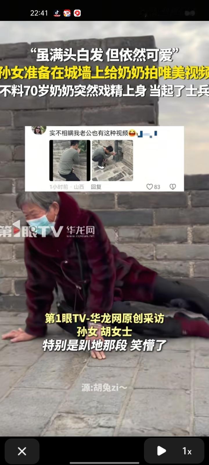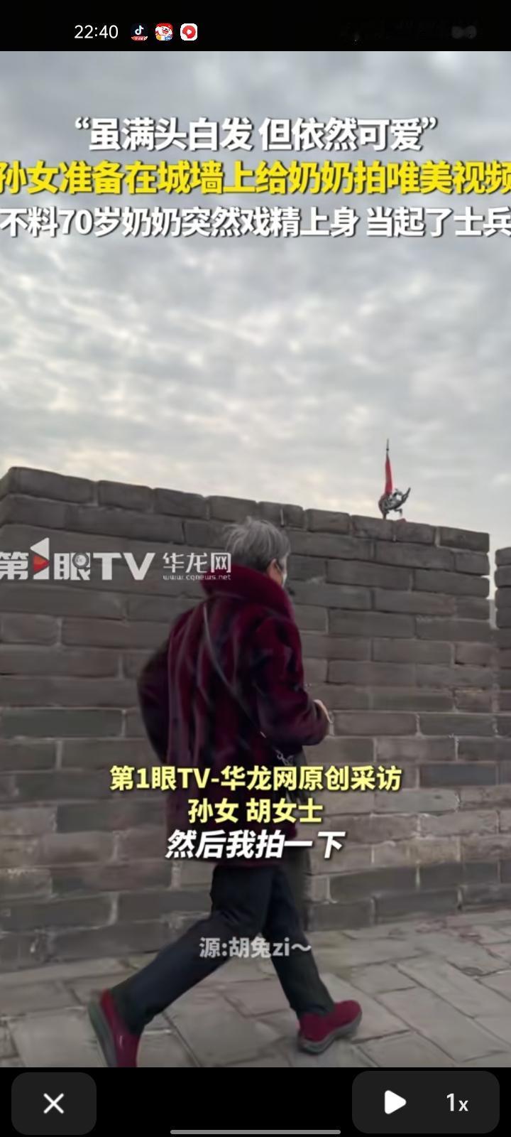 12月3日,陕西西安。孙女带着爷爷奶奶去西安旅游,刷到一个城墙上眺望远方的视频很有感觉,准备给奶奶拍视频时,不料奶奶突然跑起来,像士兵一样,特别是趴地那段特别好笑。