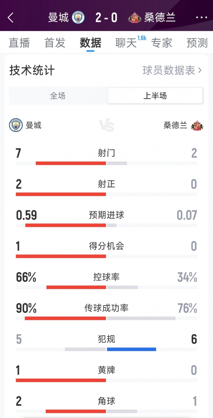 直播吧12月6日讯本轮英超曼城对阵桑德兰半场战罢,曼城暂时2-0领先,以下为双方半场数据对比: