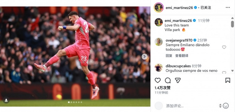 本场比赛维拉门将马丁内斯做出7次成功扑救,帮助球队拿下胜利,赛后他也在社媒晒出庆祝胜利照片,配文写道:“我爱这支球队,维拉公园球场!”