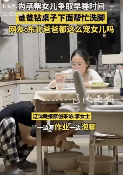 这届家长太拼了!​ 辽宁一位老爸为让初中女儿多睡半小时,竟钻到书桌下给她搓脚去臭。妈妈还叮嘱,香皂洗一遍,清水再投一遍!视频一出,全网争论炸锅!有人骂巨婴制造机,有人叹这届孩子太苦,爹妈只能这样抢睡眠。 其实,这种桌下洗脚何尝不是中国家庭的缩影?中学生作业堆成山,熬到凌晨是常态。父母哪是溺爱,分明是拿体力换孩子喘息机会!有家长坦言,闭眼穿衣,公交补觉、被窝吃饭…这些神操作早成家庭默契。 但溺爱红线在哪?专家敲黑板!包办代替,特殊待遇,轻易妥协才是真坑娃。真正的爱,是孩子需要时搭把手,而非无底线代劳! 如今教育内卷下,父母们挣扎于独立培养与生存现实间。或许如网友所说,只要三观正,暂时伺候又何妨?​ 那些深夜书桌下的温情,终会成为孩子穿越风雨的底气。 你怎么看?爹妈该卷还是放手?评论区蹲你的高见!​