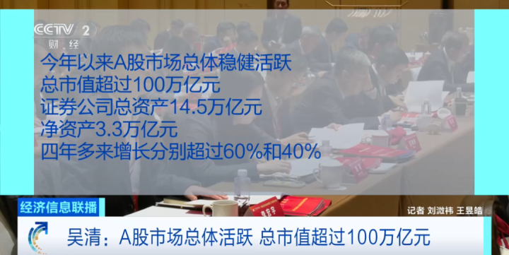 吴清介绍,今年以来A股市场总体稳健活跃,总市值超过100万亿元。证券公司总资产14.5万亿元,净资产3.3万亿元,四年多来增长分别超过60%和40%,助力近1200家科技创新企业上市。同时,外资机构境内业务加快布局,已有11家外资独资或控股证券公司在华展业兴业。