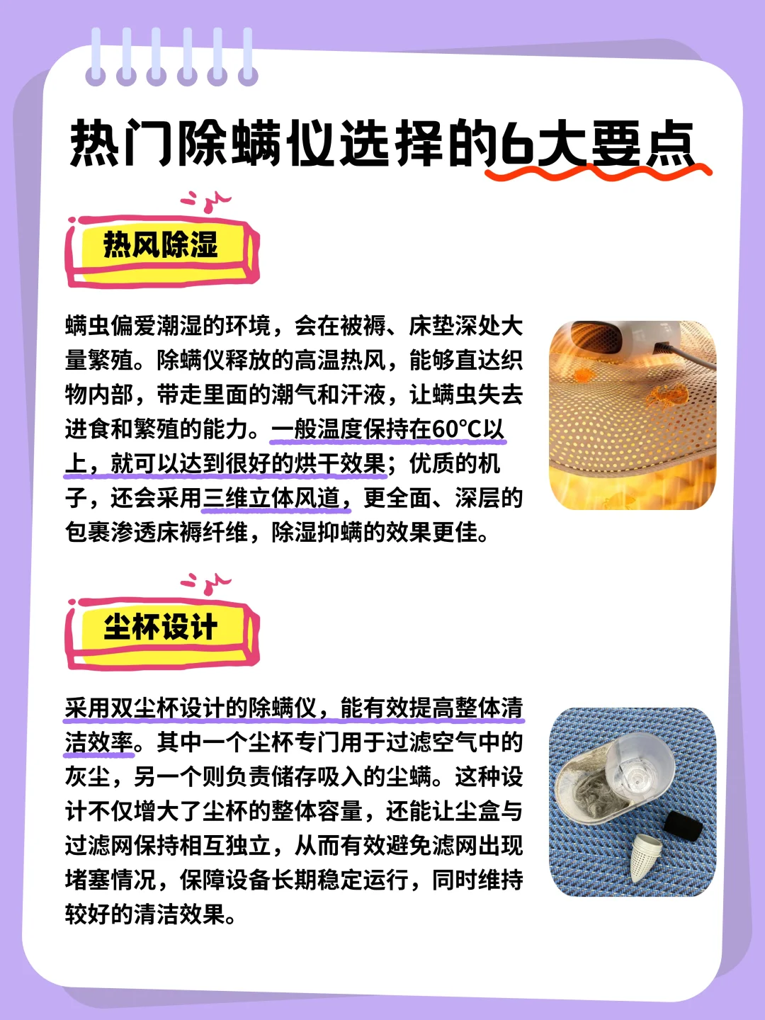[三R]热风除湿:除螨仪释放的高温热风,能够直达织物内部,带走里面的潮气和汗液,让螨虫失去进食和繁殖的能力。那些热风温度更高、且采用多风道设计的机型,烘干覆盖的面积更广,除湿效果也会更出色。