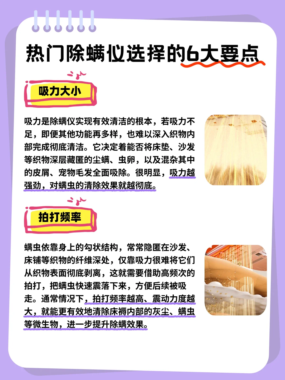 [一R]吸力大小:若吸力不足,即便其他功能再多样,也难以深入织物内部完成彻底清洁。它直接决定着能否将床垫、沙发等织物深层藏匿的尘螨、虫卵,以及混杂其中的皮屑、宠物毛发全面吸除。很明显,吸力越强劲,对螨虫的清除效果就越彻底。