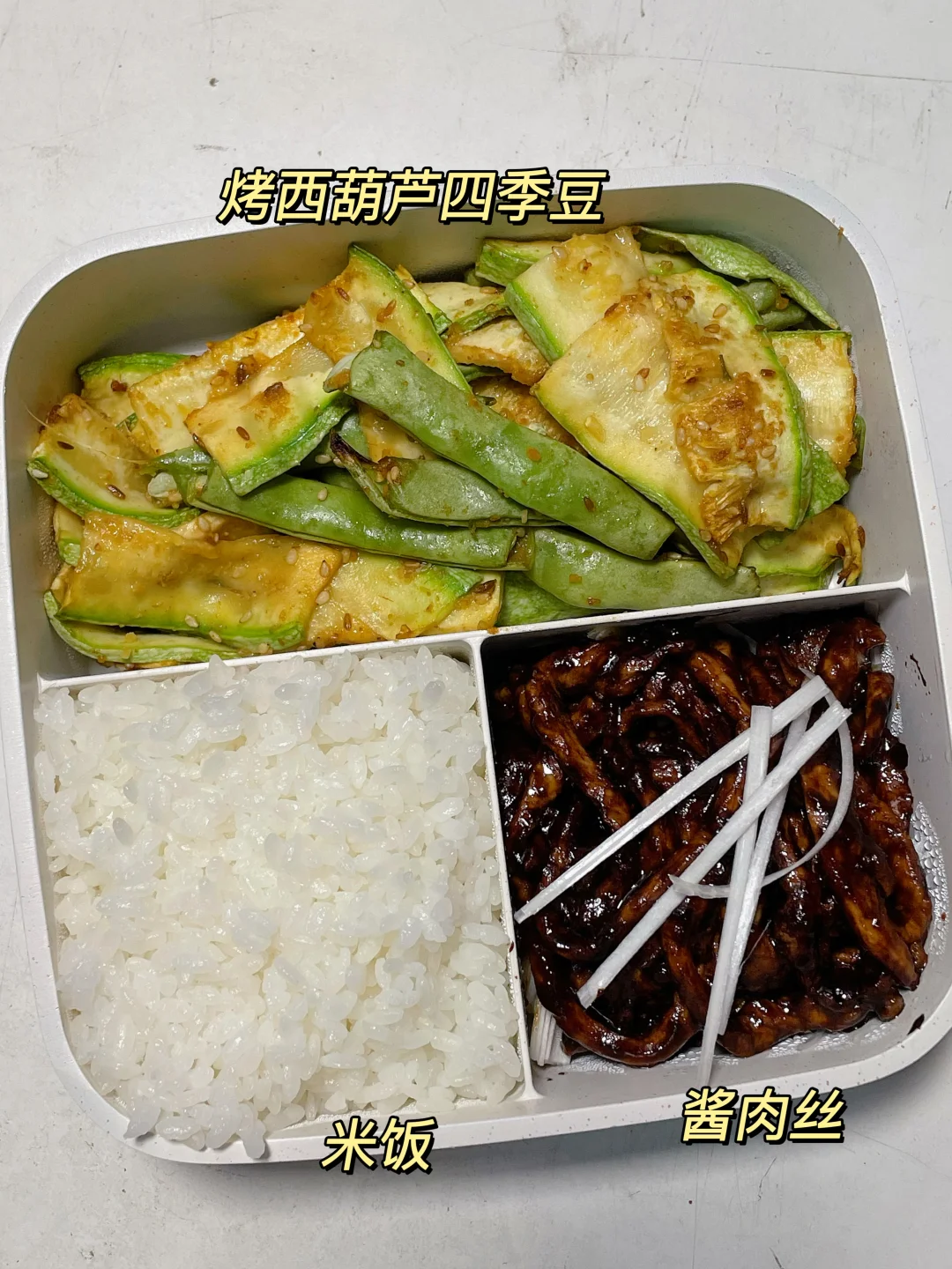 📍米饭+酱肉丝+烤西葫芦四季豆