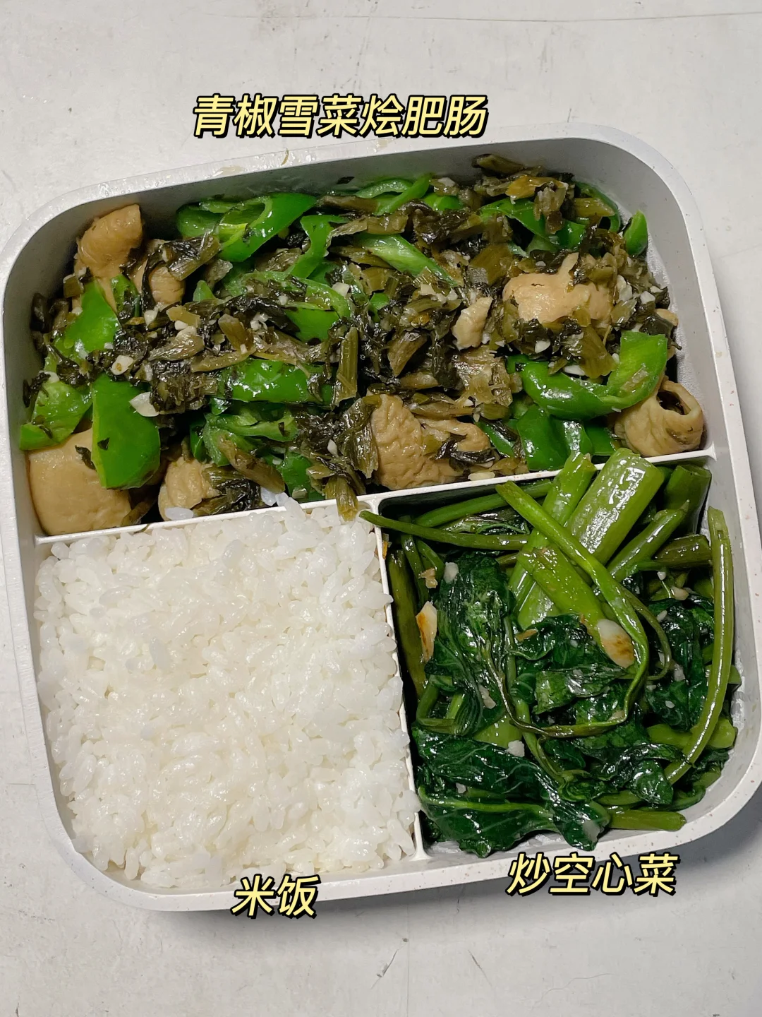 📍米饭+青椒雪菜烩肥肠+炒空心菜