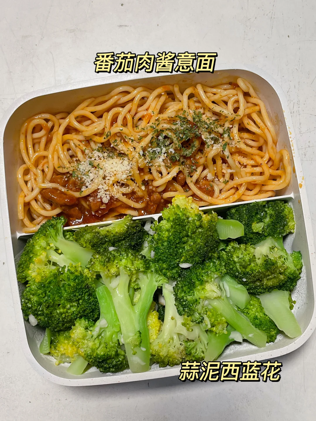 📍番茄肉酱意面+蒜泥西蓝花