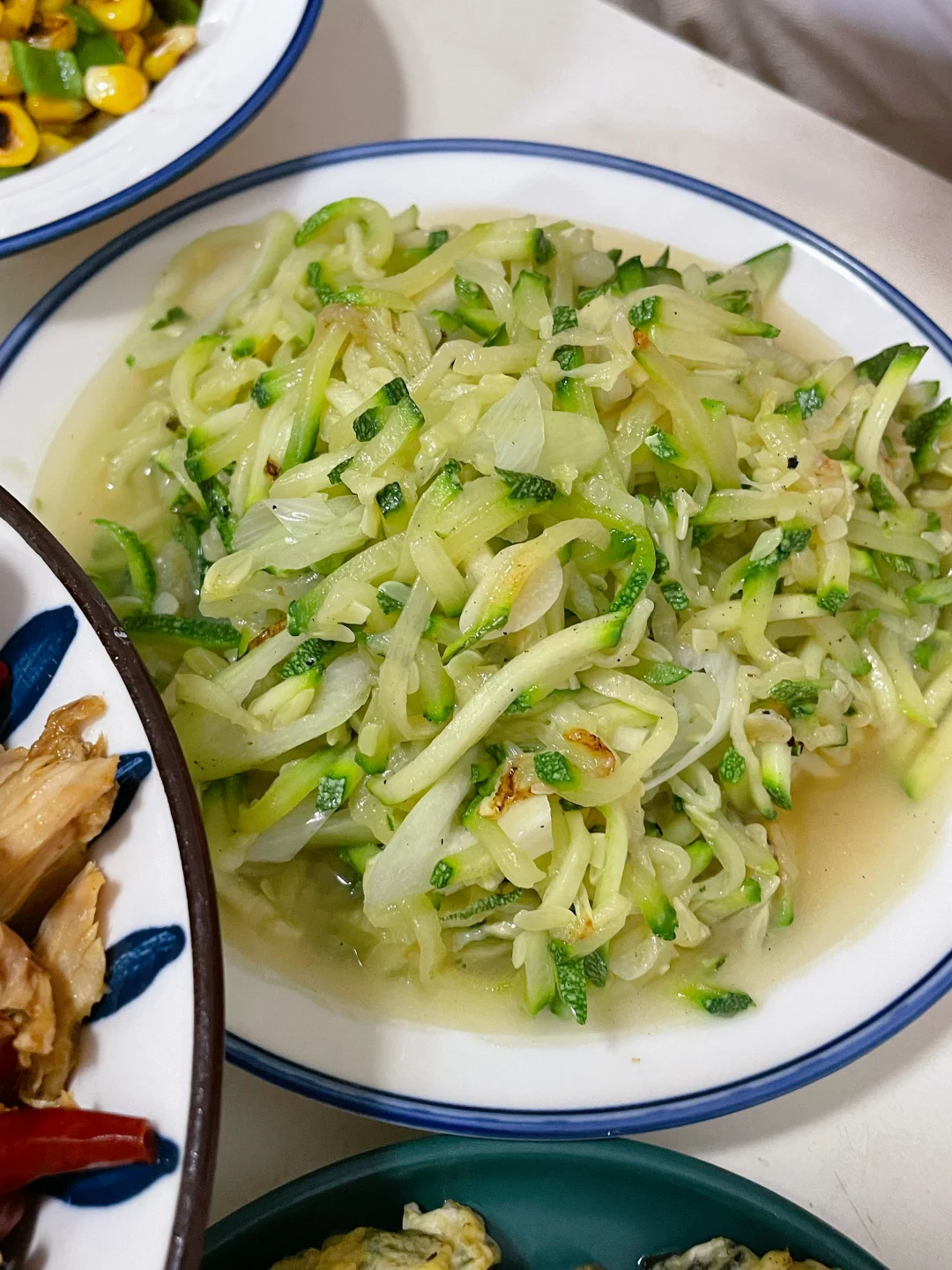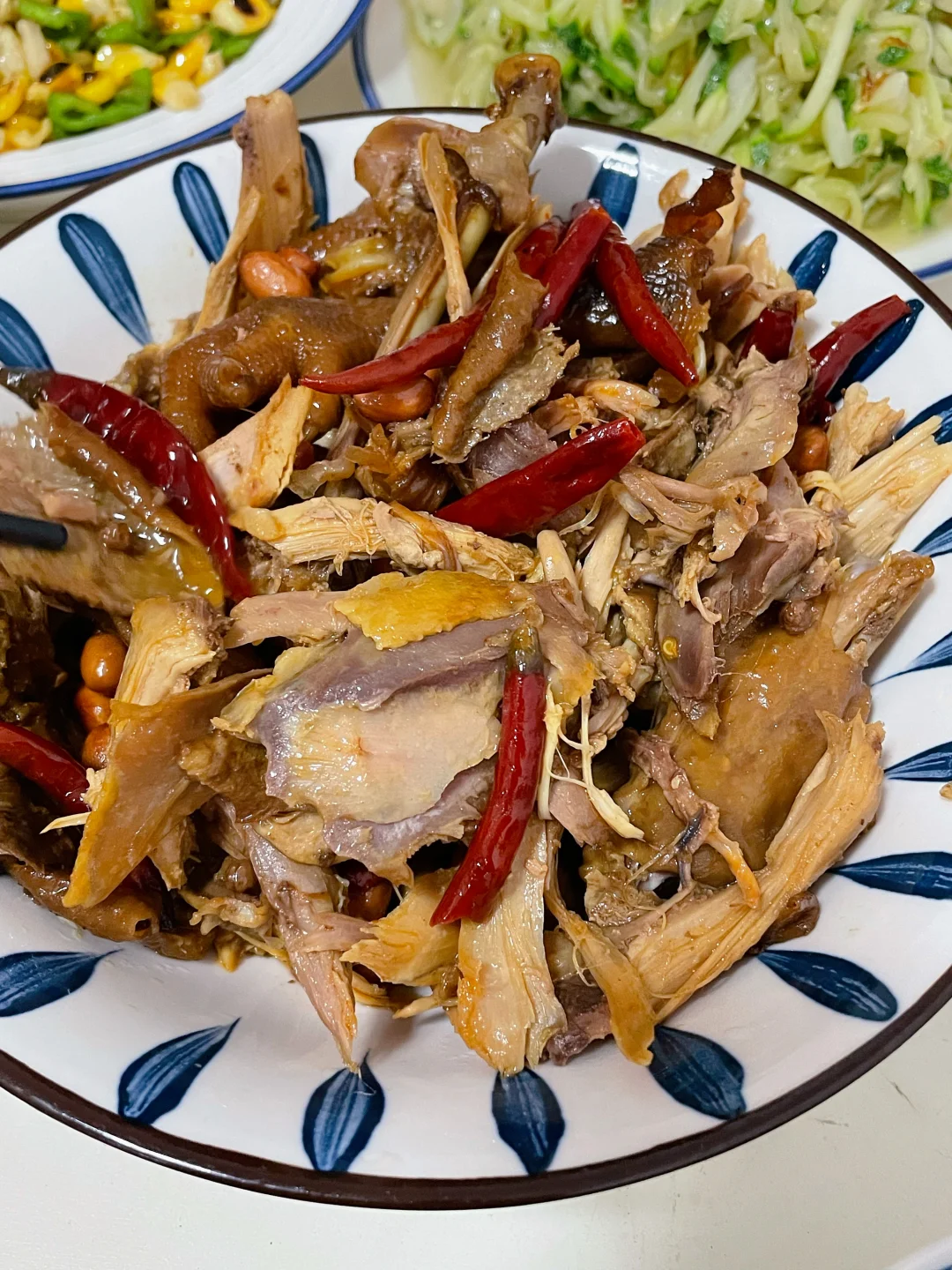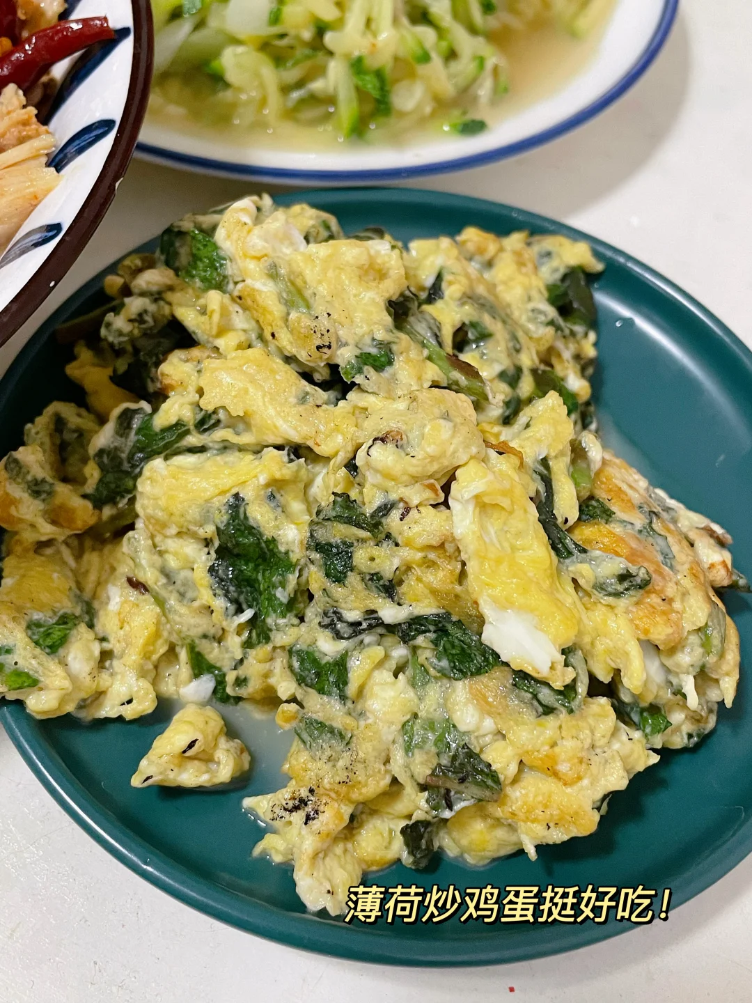 午 薄荷炒鸡蛋+手撕椒麻鸡+炒嫩南瓜+青椒炒玉米+卤菜