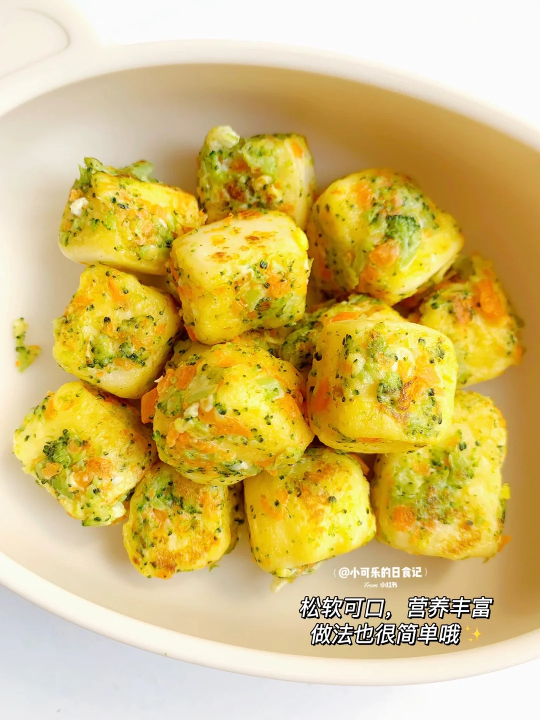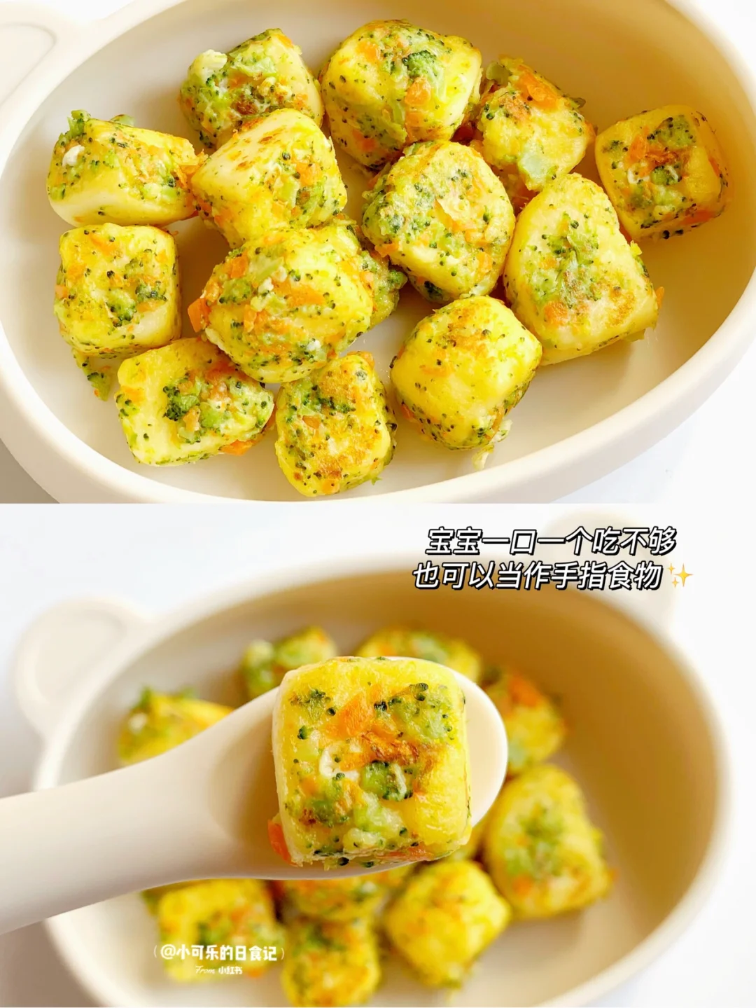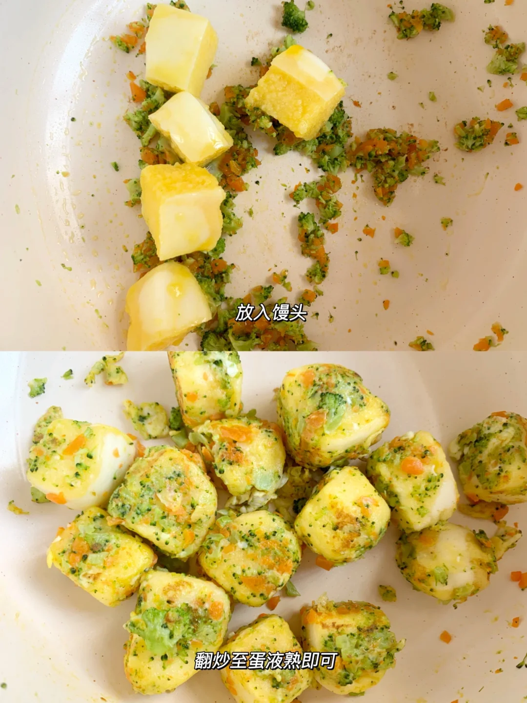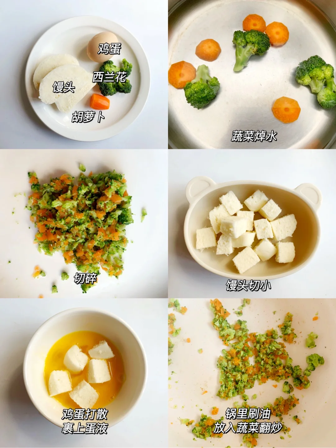 1⃣️西兰花和胡萝卜焯水切碎,馒头切小