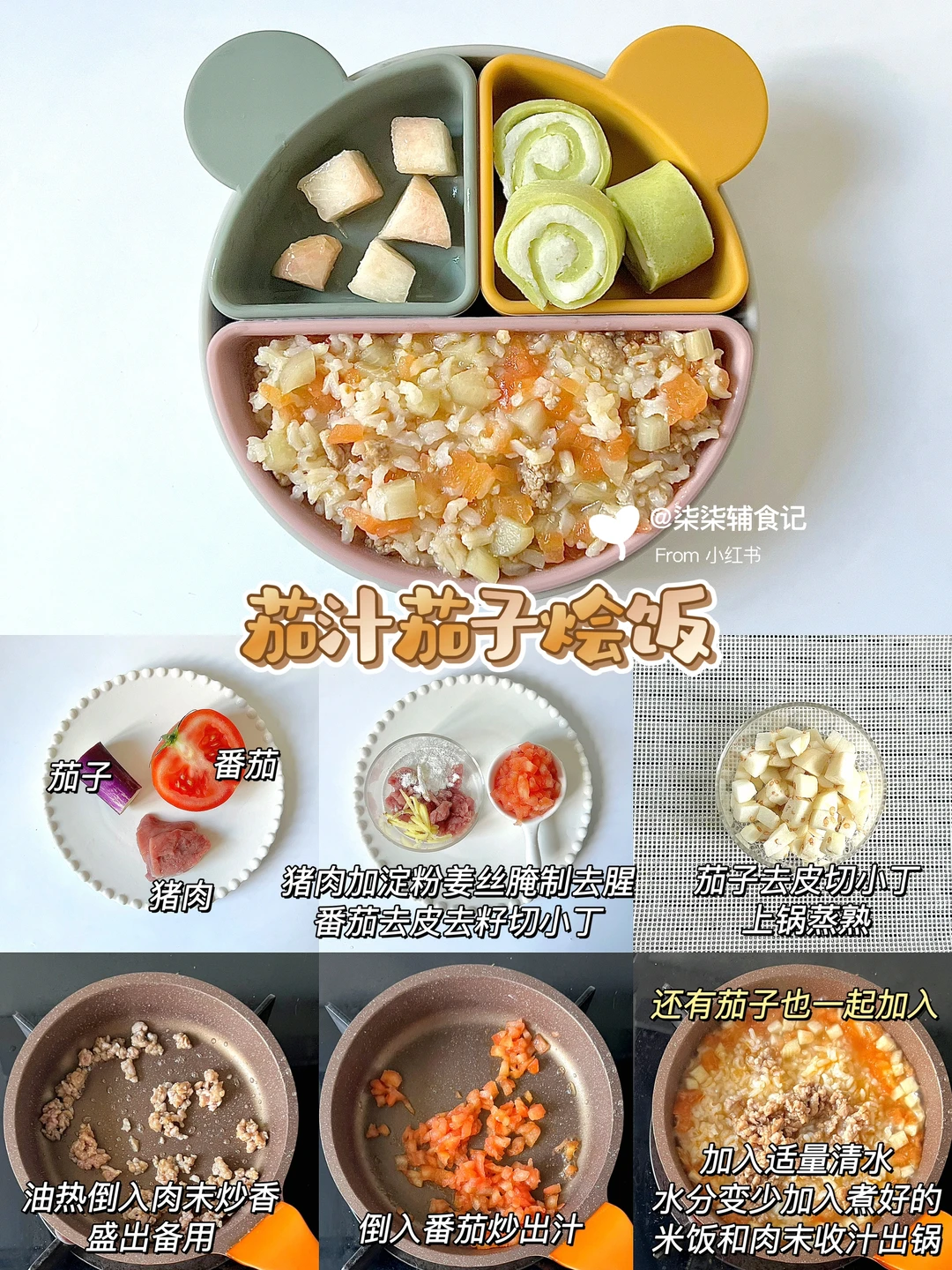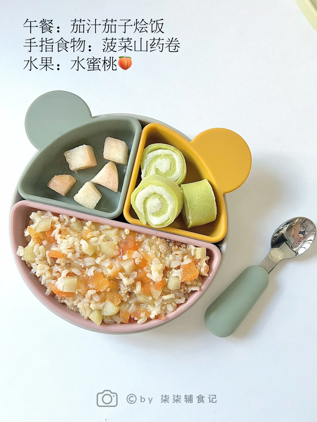 午餐茄汁茄子烩饭和菠菜山药卷,烩饭的茄子可以先蒸熟,蒸熟后可以翻炒一下也可不炒直接和米饭一起加入煮熟就可以啦,菠菜山药卷配方×2可以做2卷,也不用愁着蛋清要怎么处理😄