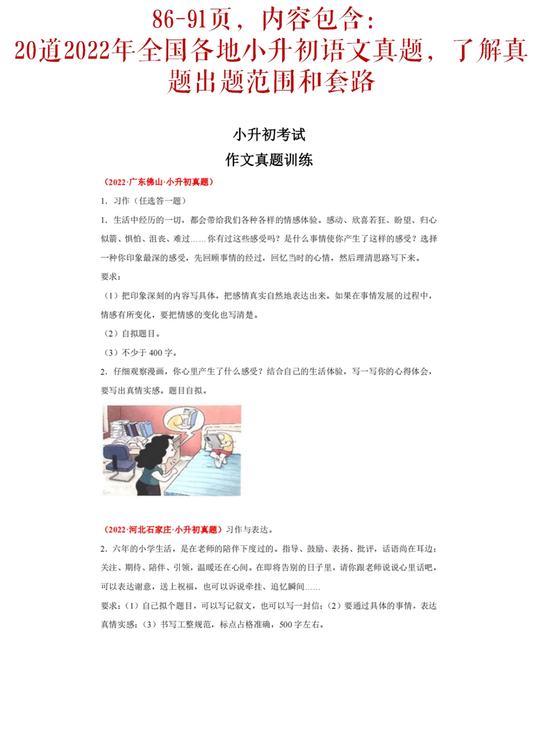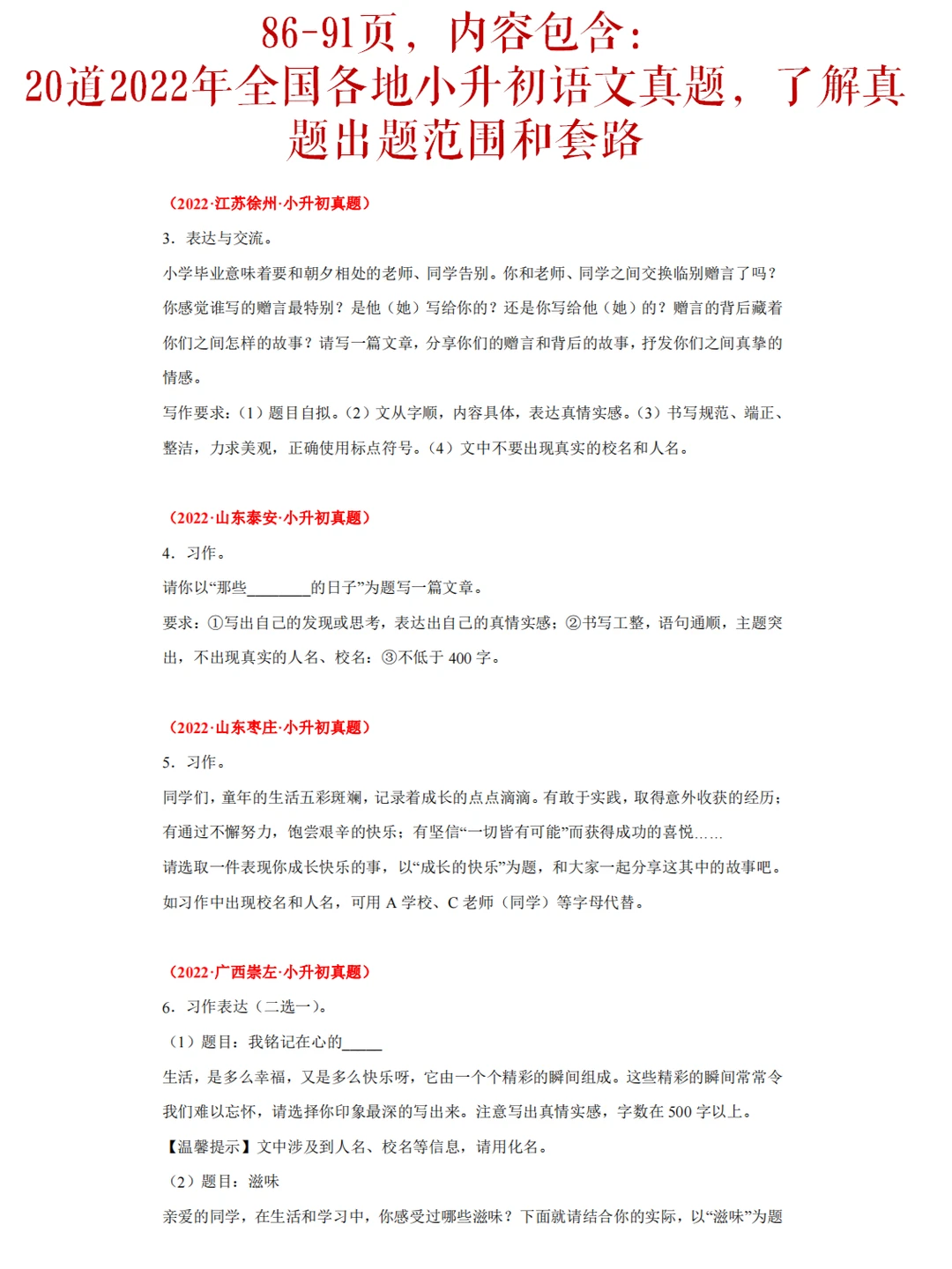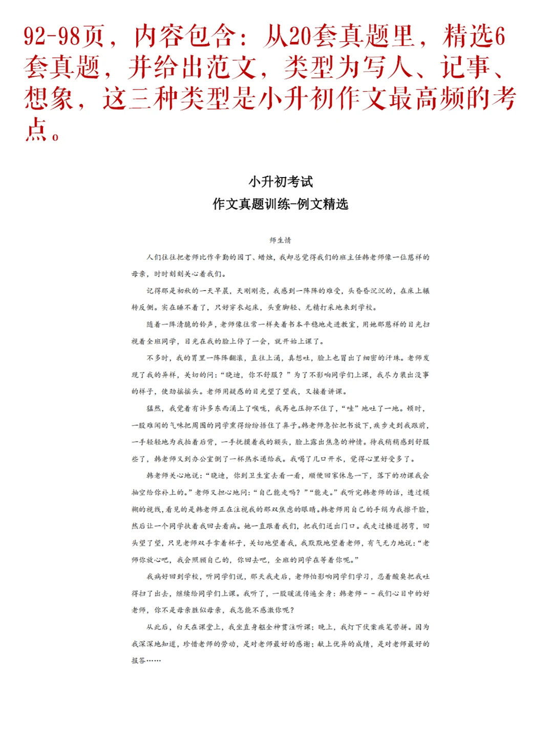 从20套真题里,精选6套真题,并给出范文,类型为写人、记事、想象,这三种类型是小升初作文最高频的考点。