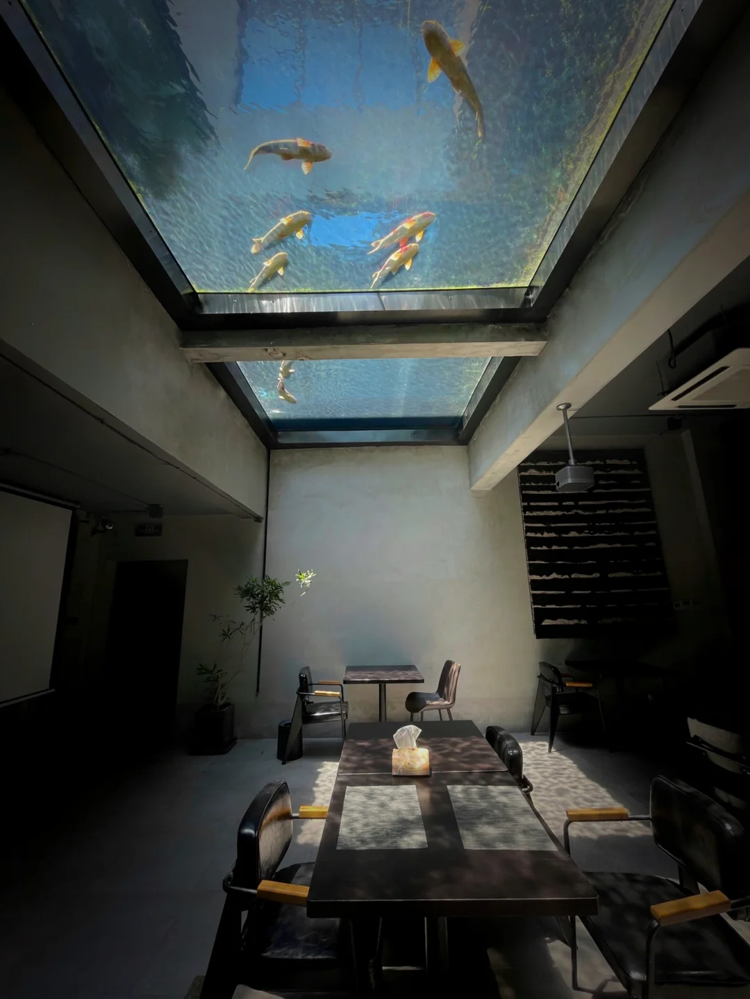 ✨餐厅天花板为全透明玻璃空中鱼池,用餐时能看到波光粼粼的光影律动,别具浪漫;