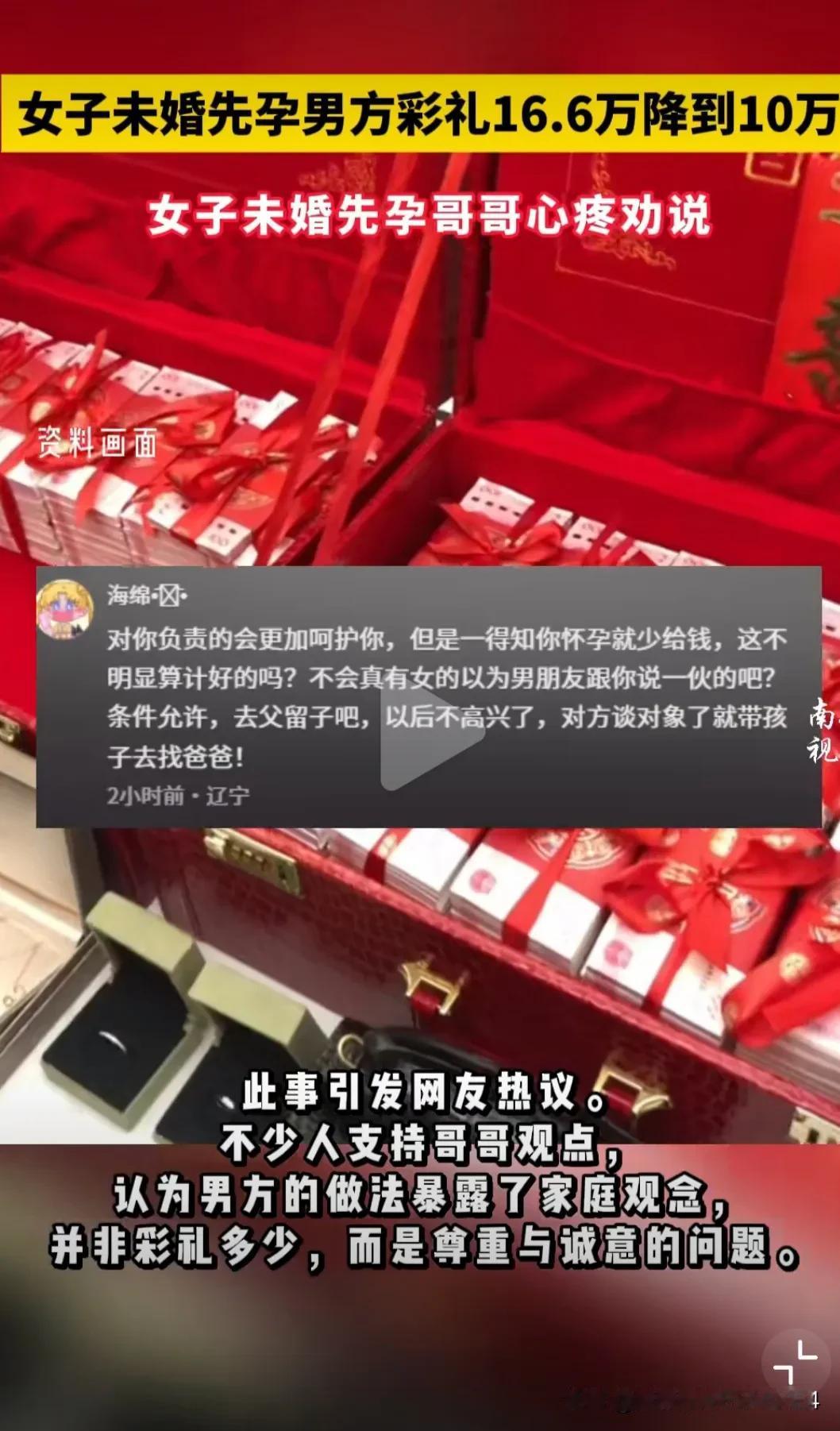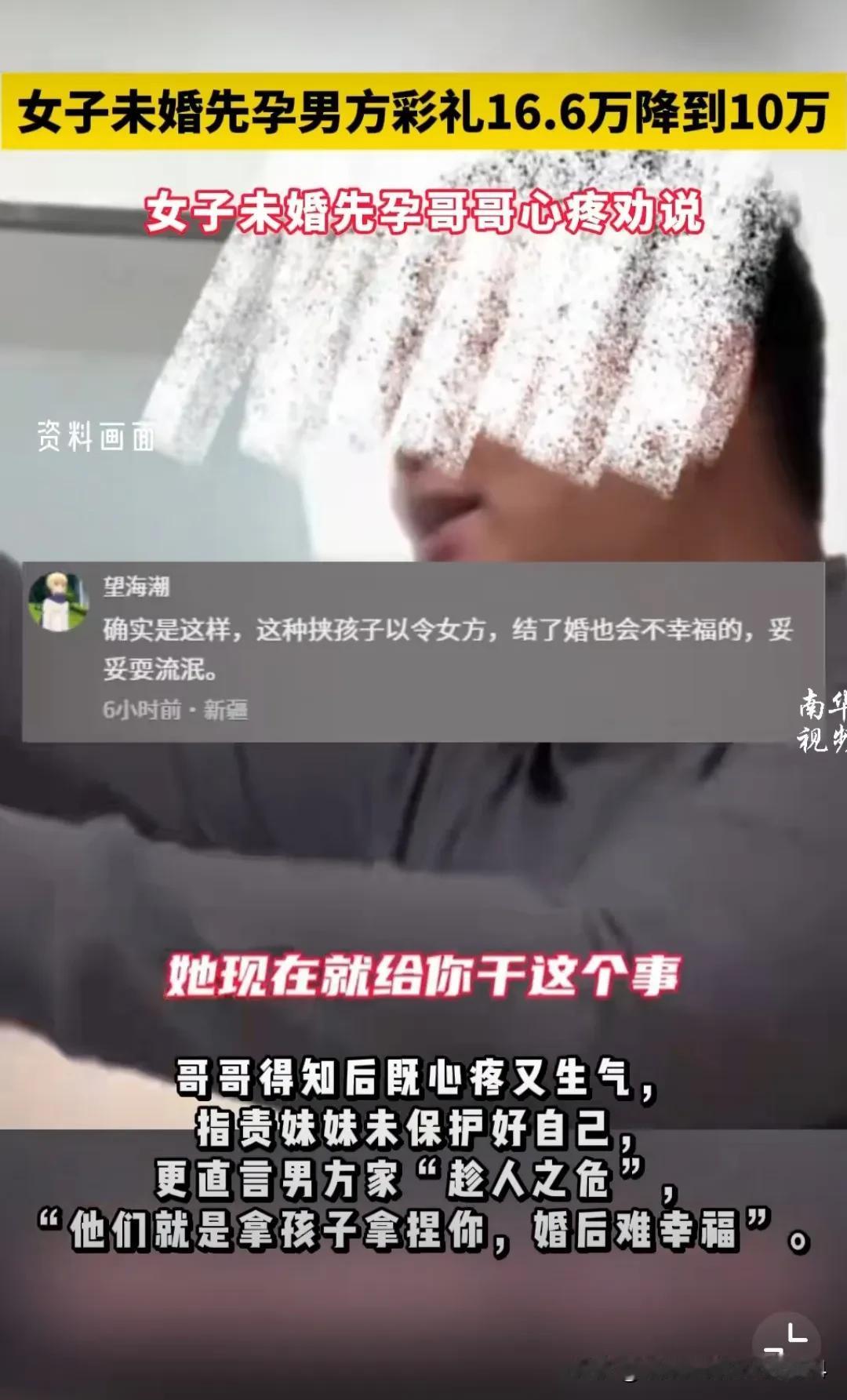 女子未婚先孕 男方彩礼16.6万降到10万 女子哥哥知道妹妹重感情,但还是劝说她不要跟这个人结婚: 1,未婚先孕,这个男的绝对不负责任。现在这么多措施,怎么会怀孕的 2,你对象他妈妈知道你现在未婚先孕,这个事之后,说好的(彩礼)16万8,现在呢就给你10万。她现在给你干这事,以后你俩还有法过吗? 3,这个孩子如果你不想要,想分手咱随时可以去(打胎) 4,你不要让你对象觉得有了孩子就可以拿捏你。就你对象今天这表现,我感觉你俩以后过不好。 果然还是男人了解男人,此事引发热议,众多网友纷纷给这个哥哥点赞。有网友说,好想有一个这样的哥哥,给我个忠告吧,他脾气很不好,可是他对我真心,可以嫁吗? 还有网友说,一定要听哥哥的,想到自己以前就觉得好傻,就因为我喜欢他,觉得他长的帅,脾气好,但家里条件不好,我怀着孕还是嫁了。结果他妈妈说给2000彩礼就差不多了,那是2011年啊。当时我不懂事还是硬嫁了,后悔! 这个哥哥给妹妹的忠告,简直是教科书级别,值得所有结婚男女拜读! 结婚的意义是两个人生活,有人商量,有人陪伴,能成为彼此的依靠!而负责、情绪稳定才是婚姻的基石! 偶尔给我们笃定的感情放放风,也许就能像这个哥哥一样看得更真切!