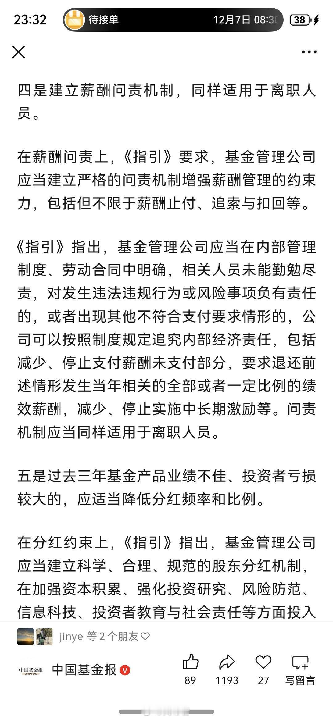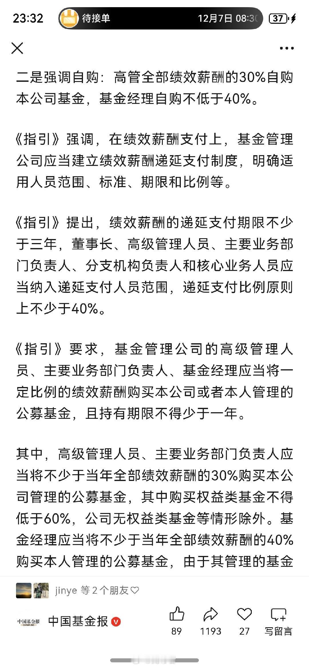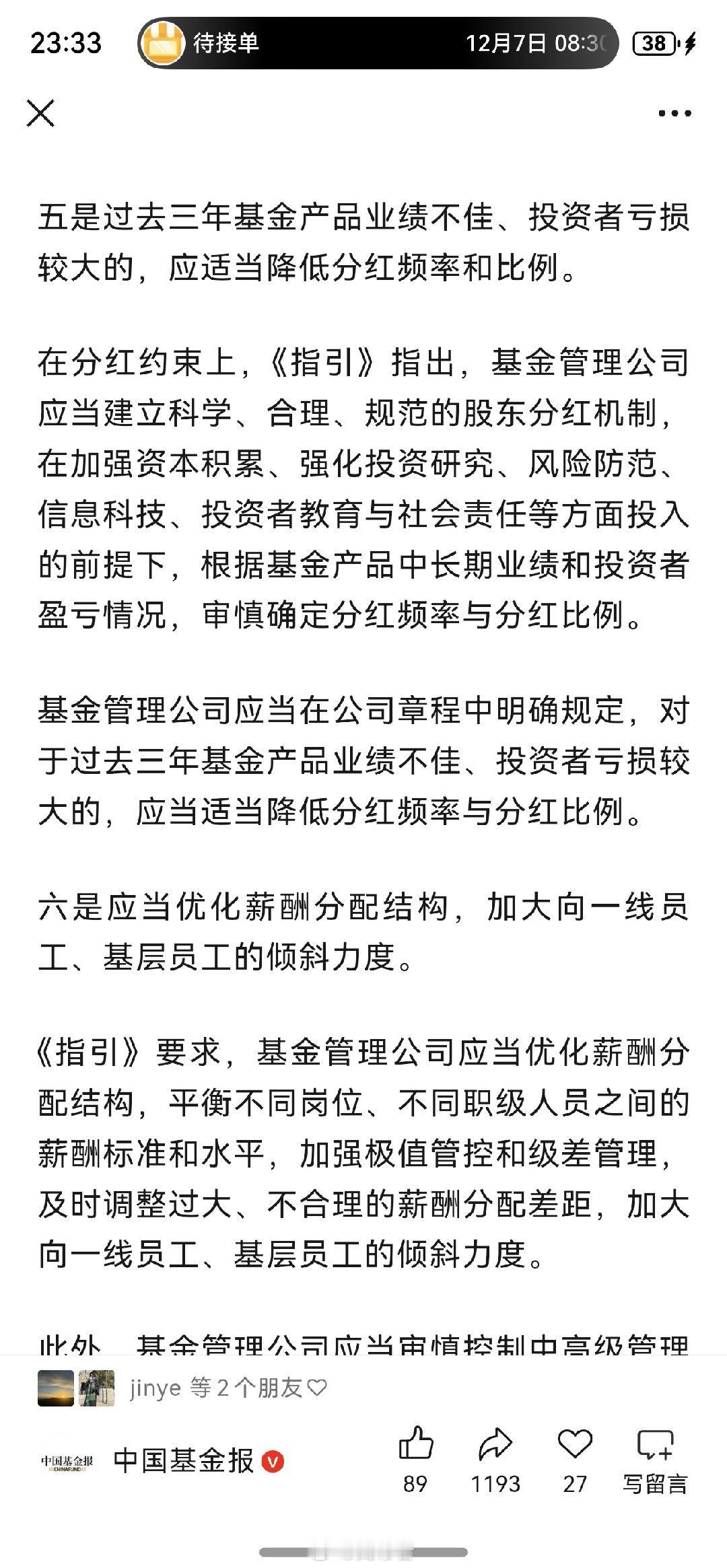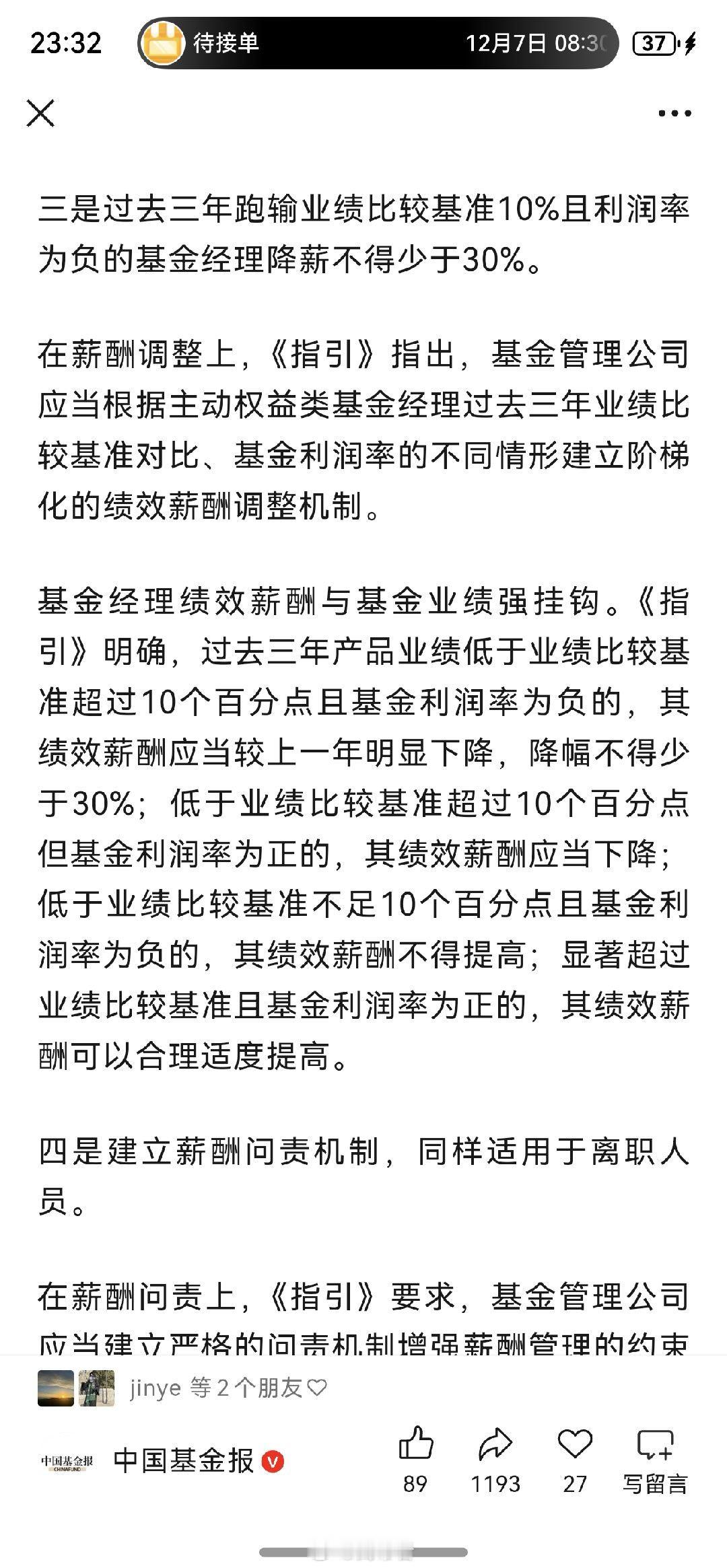 刚到家,看到媒体报道《基金管理公司绩效考核管理指引(征求意见稿)》已经下发,我粗粗看了下,第一条和第三条的影响最重磅了,简单聊几句,不一定对,欢迎指正。1、第一条里,对销售增加了客户盈亏情况的考核,考核权重应当不低于50%。以后销售的考核大头可能就是:一半保有量+一半客户盈利比,这里的客户应该是指至少持有三年以上的客户,一般来说,能坚持持有三年以上的盈利客户并不多的,大部分持有时间长的都是套住的客户。倒是那些三年期产品,尤其是21年,22年发的,至今还亏钱的产品,那对销售影响很大啊。未来基金公司要发持有期产品的,得好好掂量掂量了,则时能力很重要了。别三年下来净值还在水面下,客户都亏钱,那大家白干……我还想到个问题,基金经理还有业绩比较基准,熊市时,比基准跌得少就行,反正都亏,比谁亏得少,但客户盈利比呢,熊市时,大部分客户也都亏,但不能比谁亏得少就行的吧,和客户自行则时有很大关系。熊市中对客户盈亏情况的考核,很考验智慧。可能我格局小了,我懂了,以后可能咱们就只走长牛慢牛了。2、第三条更是重磅啊,我个人认为,未来再出现顶流主动权益基金经理的可能性很小了,基金公司也不要再幻想通过打造顶流基金经理来吸引规模了,不过,过去三年是不是还是太短了,比如有的基金经理近三年产品业绩低于业绩比较基准10个点,但近五年产品业绩又高于业绩比较基准10个点,那该降薪还是加薪呢?再仔细想想,这是滚动累计的三年,对主动管理能力要求是非常高了,比如21.22.23年这三年跑赢基准了,但是24年没做好,大幅跑输基准,导致22.23.24年这三年跑输了,但25年又做好了,导致23.24.25年又跑赢基准了,或者23.24.25再跑输,但24.25.26年这三年又跑赢。那这怎么算呢?基金