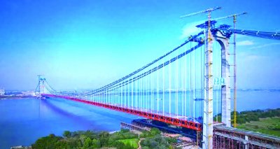 这座大桥横跨鄂州和黄冈两地,主跨达1860米,是世界最大跨径的四主缆悬索桥。