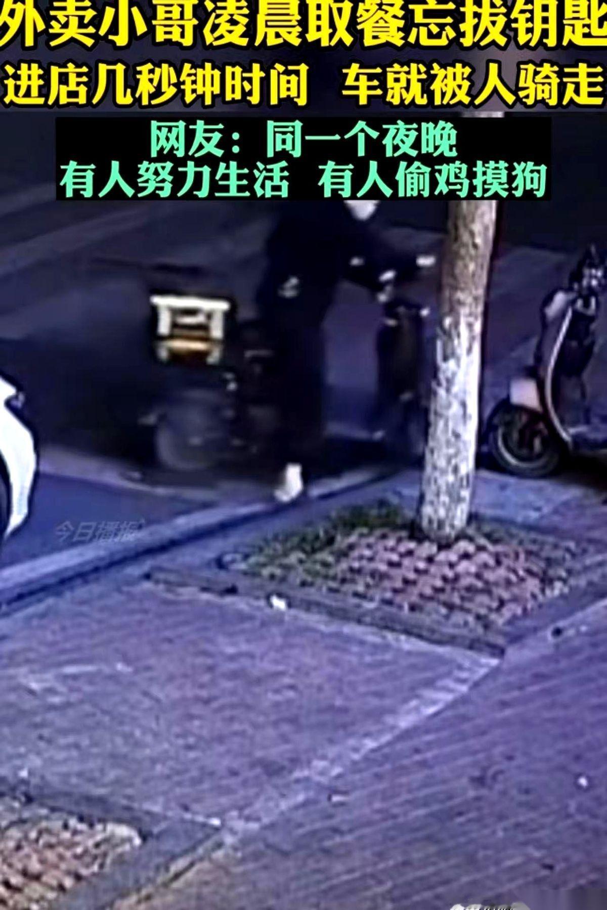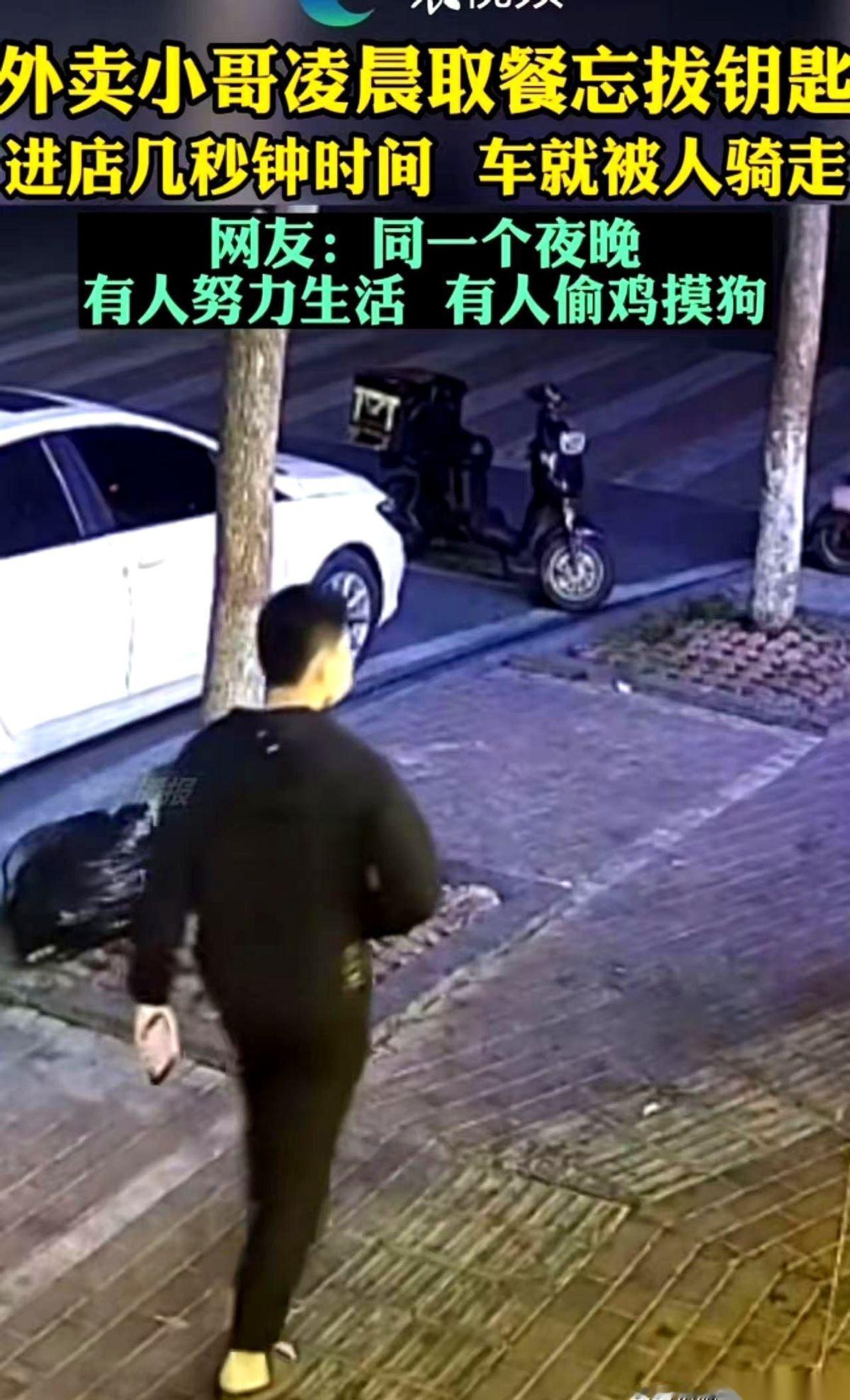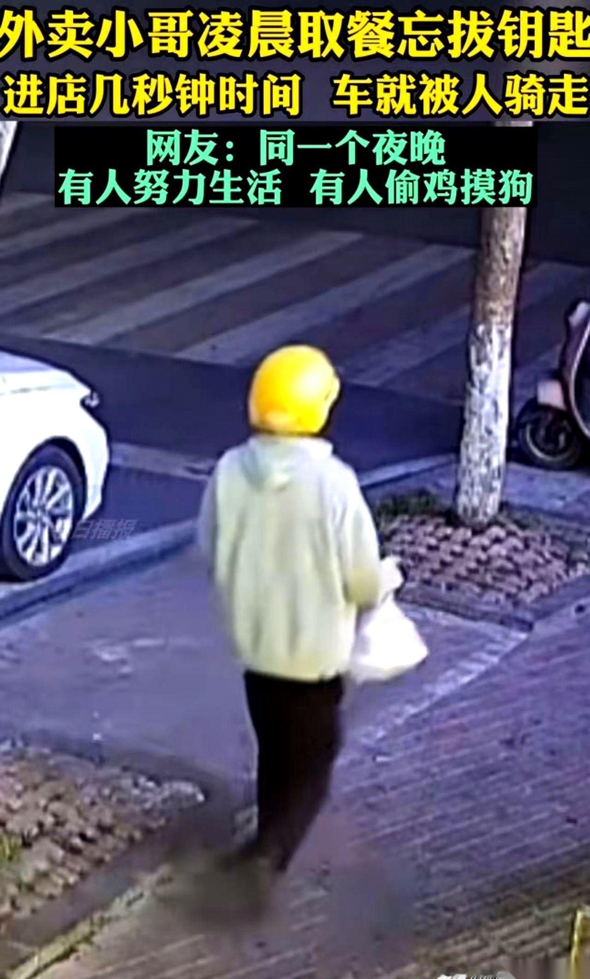 上一秒还蹦蹦跳跳地跑着去取餐,下一秒出来,车没了。 就这么几秒钟。 凌晨的街头,有人为了生活豁出命去跑,有人却在后面,悄悄惦记着他吃饭的家伙。 那个监控画面,我看了都来气。小哥那几步轻快的小跑,你一看就知道,他对生活还有股子热情,还有奔头。 他不是麻木地在送餐,他是真觉得,多跑一单,日子就能好一点。 结果呢? 一个路过的,看车钥匙没拔,心里那点贪念就压倒了一切。 骑上车,油门一拧,扬长而去。 那叫一个干脆,那叫一个熟练。 我不知道这人缺不缺钱,但我知道他缺德。 真的,有些事是不能干的。医院里偷救命钱,灾区发国难财,还有,就是对这种凌晨还在奔波的打工人下手。 你偷的不是一辆车,你偷的是人家半个月的饭钱,是孩子下个月的奶粉钱,是他们家悬在半空中的那一口气。 你把人家对生活仅剩的那点儿奔头,一脚给踩灭了。 这一耳光,抽在小哥脸上,疼在我们所有靠双手吃饭的人心上。