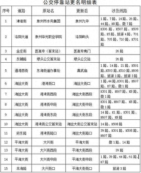12月6日,记者从泉州公交集团获悉,12月15日起,泉州公交将增设、调整、重命名部分公交站点。其中,7条线路增停8个已有中途站点,3条线路取消停靠单个中途站点,15个站点重新命名,1条线路调整首末班发车时间,3条线路重命名。具体如下: