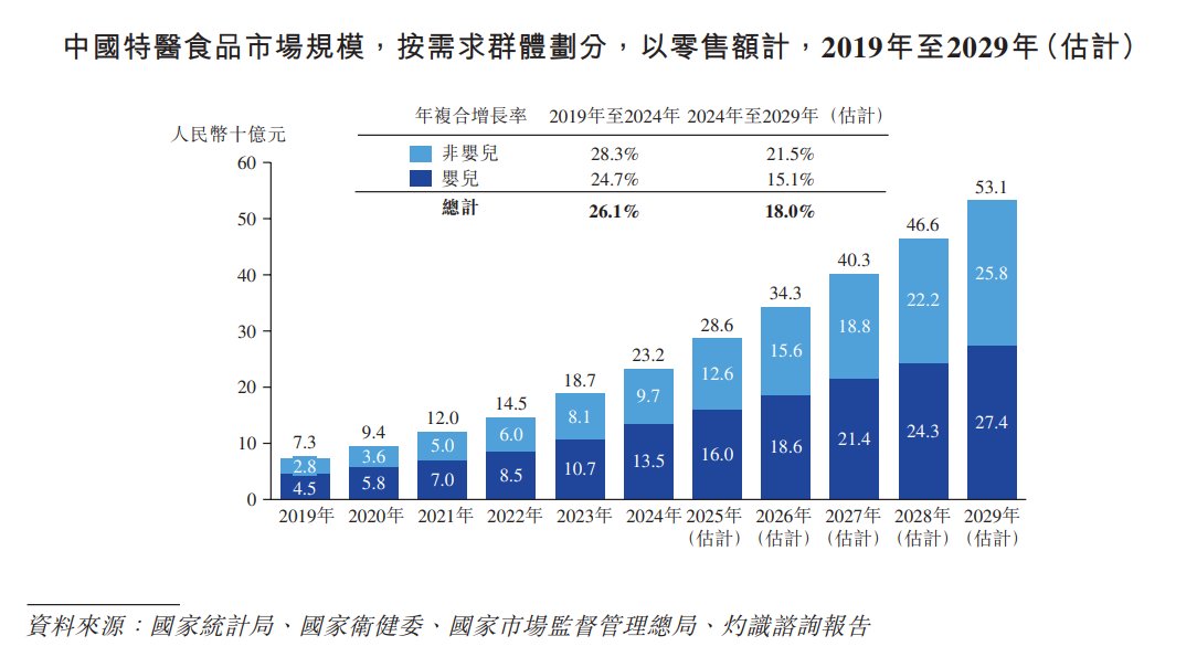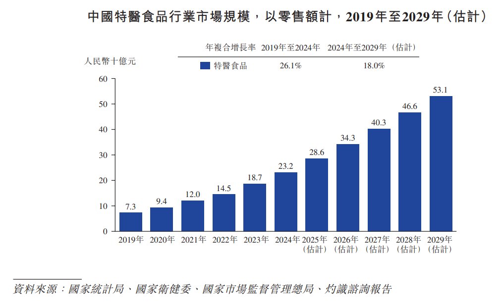 以零售额计算,中国特医食品市场规模从2019年的人民币73亿元增长至2024年的人民币232亿元,年复合增长率达26.1%。随着特医食品渗透率提升、产品品类进一步细化及销售渠道多元化,中国特医食品市场规模有望进一步增长,预计到2029年达到人民币531亿元,2024年至2029年的年复合增长率为18.0%。