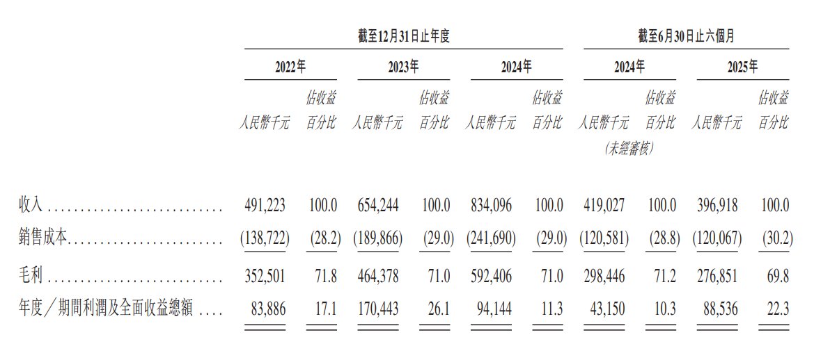 于2022年度、2023年度、2024年度及2025年截至6月30日止六个月,公司分别录得收入4.91亿元、6.54亿元、8.34亿元及3.97亿元。