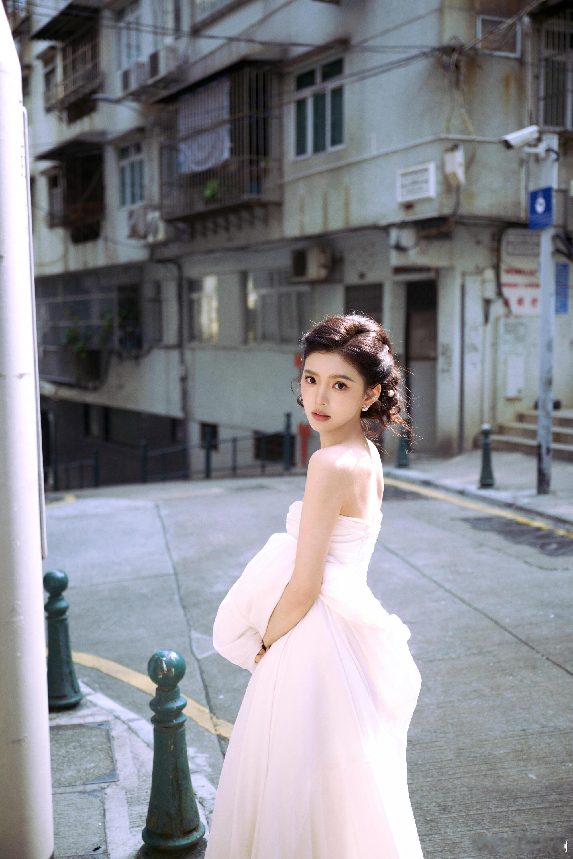 章若楠一袭纯白抹胸长裙裹着明媚气质,珍珠配饰衬出精致甜柔,街巷布景里的微风氛围感直接拉满~