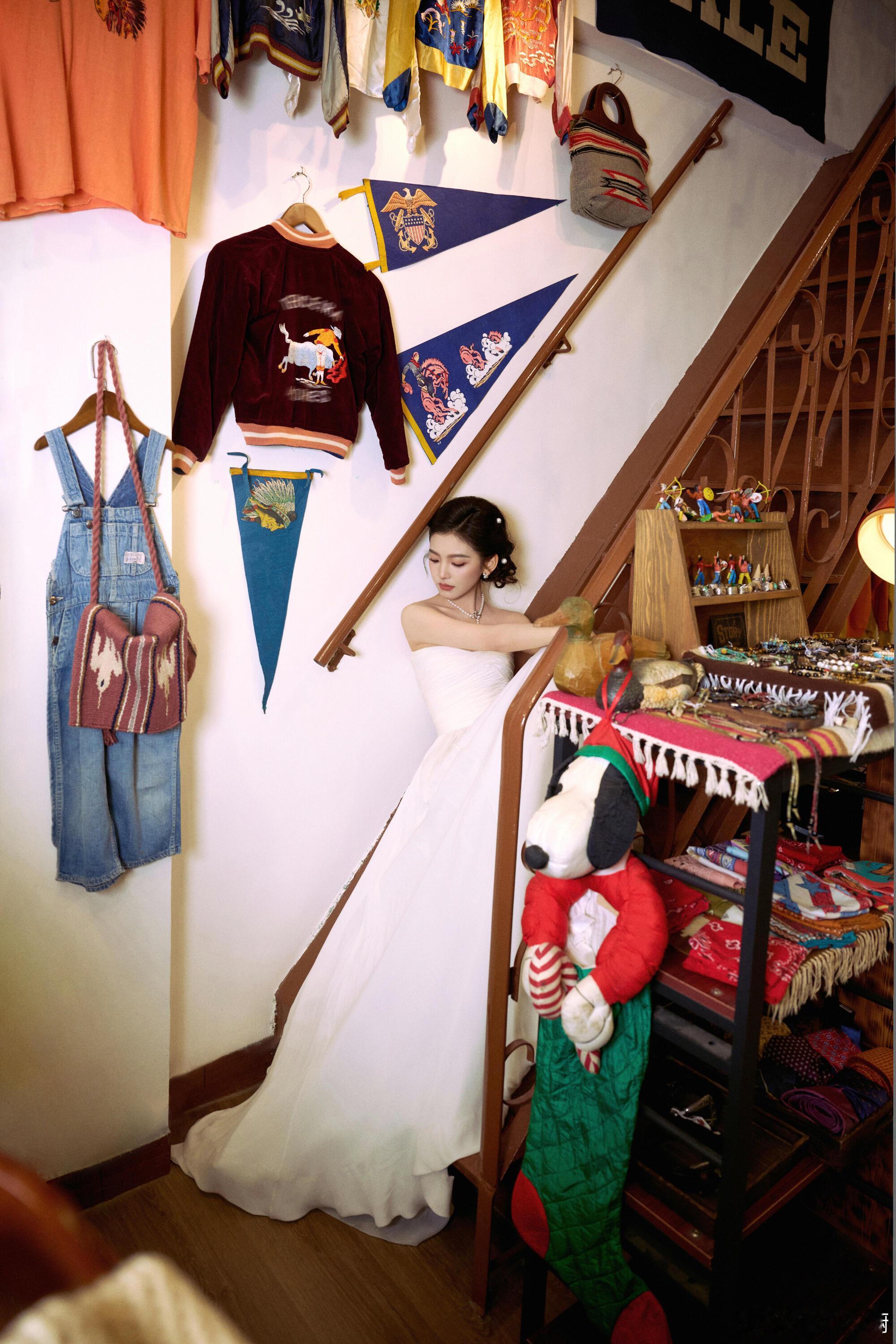 章若楠一袭纯白抹胸长裙裹着明媚气质,珍珠配饰衬出精致甜柔,街巷布景里的微风氛围感