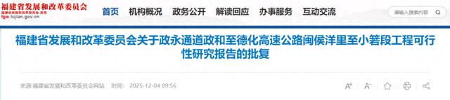 日前,福建省发展和改革委员会发布《关于政永通道政和至德化高速公路闽侯洋里至小箬段工程可行性研究报告的批复》。