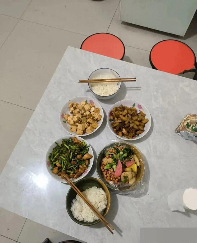 今天是妻子的生日,我下班回来的早,买了四块钱的凉菜、三块钱的蒜薹、两块钱的豆腐还有七块钱的肉,家里还有一些土豆,炒了三个菜,蒜薹炒肉土豆炒肉豆瓣酱炒豆腐,还蒸了两碗大米。妻子还有几分钟到家,给她个惊喜