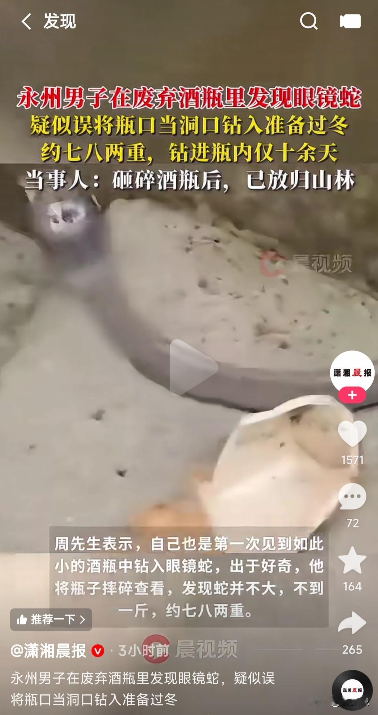 永州男子在废弃酒瓶里居然发现了一条眼镜蛇,这是蛇把瓶子口当洞口了钻入里面准备过冬吗?随后男子把酒瓶砸碎,让蛇回归了山林。 这蛇是迷路了还是眼看到冬天了已经到了冬眠的时间,随便找了一个藏身之处,没想到还被男子给发现了,蛇藏在酒瓶里面保温效果不怎么好,在冬天是不是就冻死了?毕竟酒瓶里面没有土洞里面暖和,男子把酒瓶咂碎让蛇回归山林也许就是救了蛇一命,在山洞里冬眠总比冻死在酒瓶里强吧?