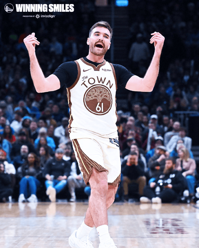 赛后,勇士社媒分享帕特-斯潘塞赛场照,并配文道:“胜利的微笑送给你!”