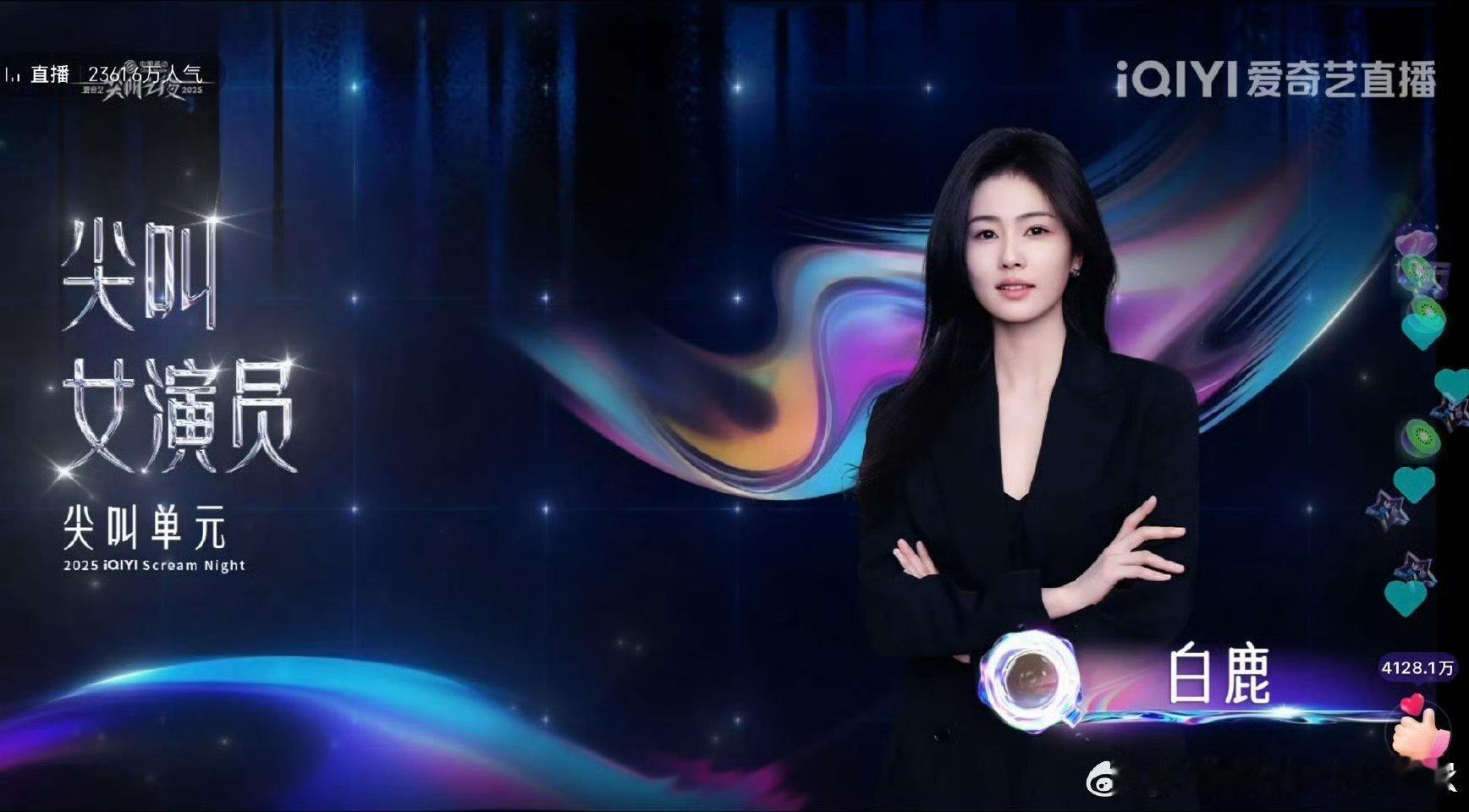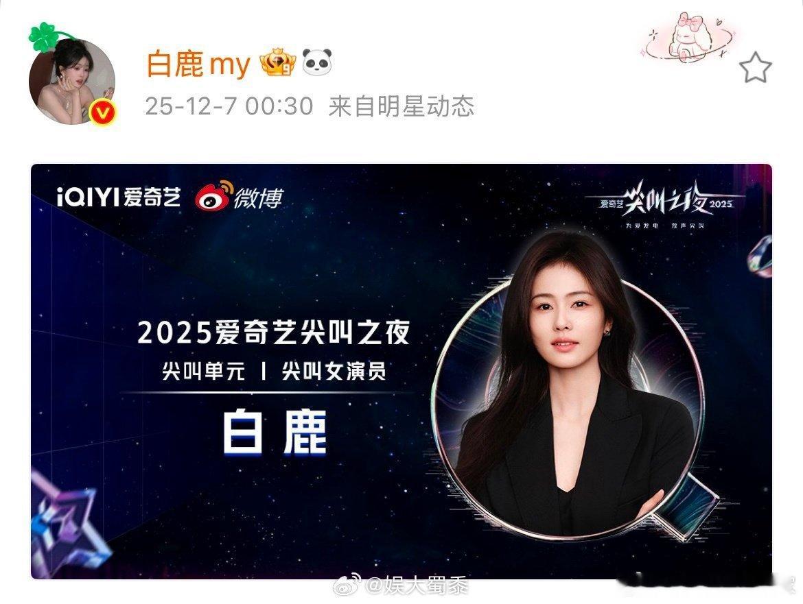 恭喜演员白鹿荣获尖叫女演员 这是自2023年以后拿的第二次尖叫女演员