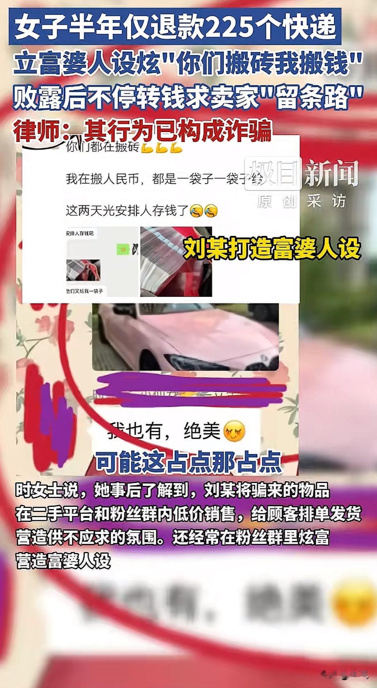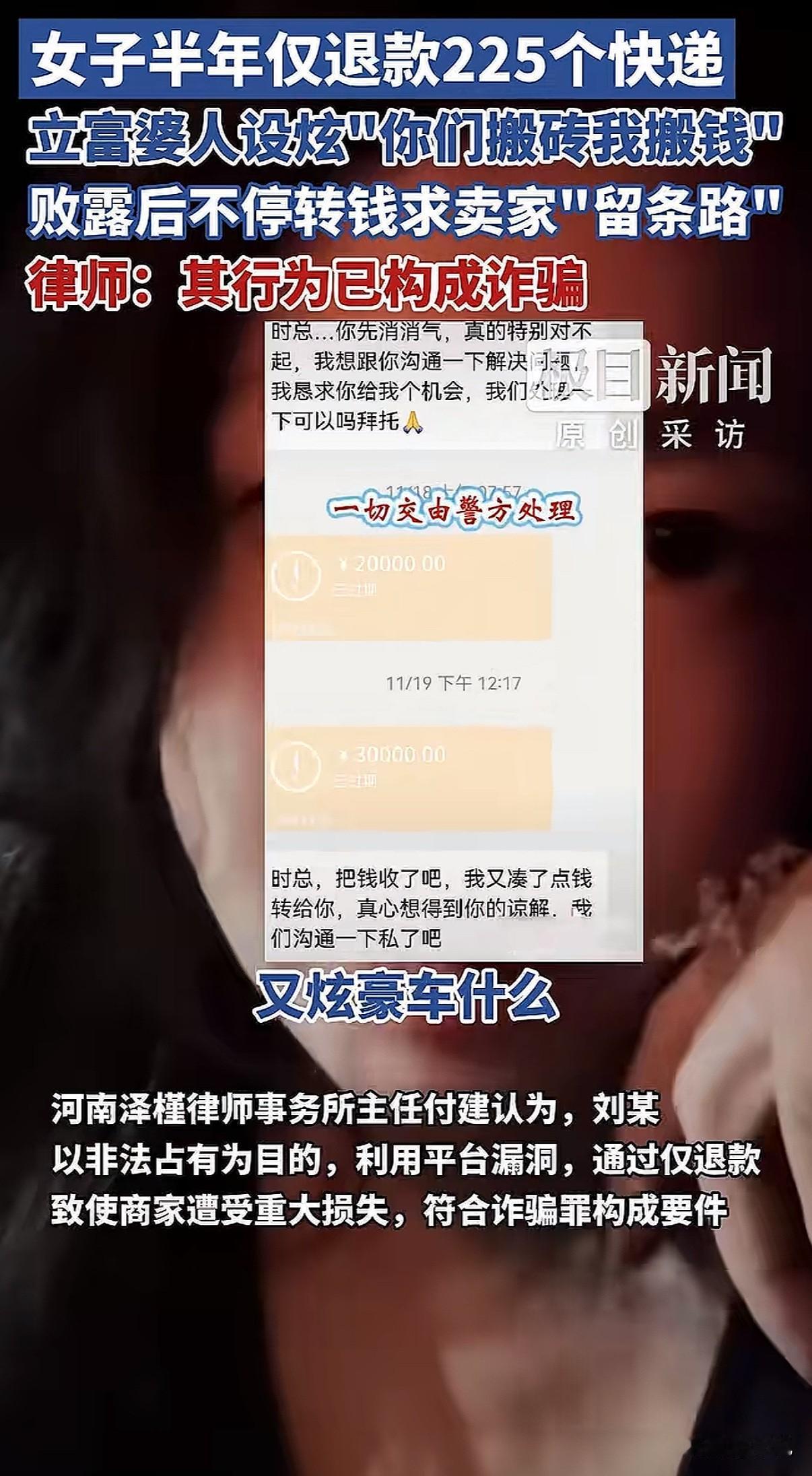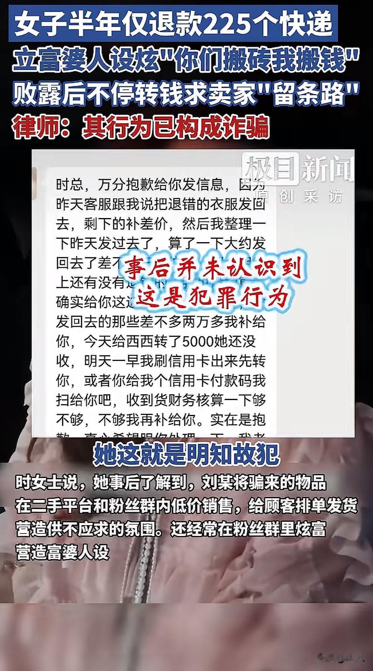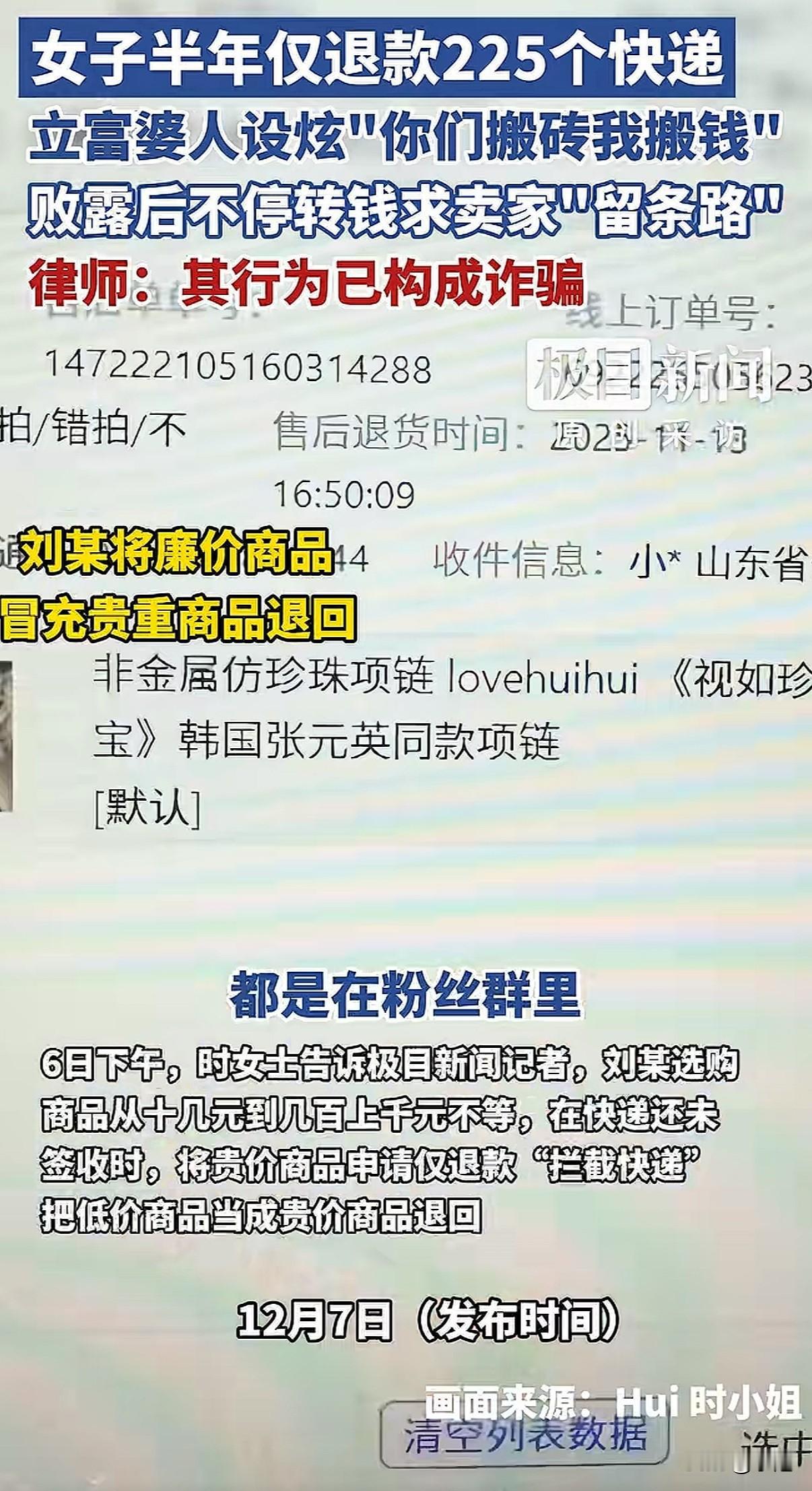 “富婆”人设翻车了。一个在网上天天炫富、号称忙着“搬人民币”的女人,被曝出她的“财富”,是靠调包骗货、坑了商家五万多块钱堆起来的。 广州的商家时女士,最近气得手都在抖。她花了半年时间,才揪出一个“高手”。山东烟台的买家刘某,用6个不同的账号,在她店里下了331单。神奇的是,其中有225件商品,都被成功申请了“仅退款”——钱拿走了,货也没回来。 算总账,时女士亏了整整5万4千块。 这钱是怎么没的?手法堪称“狸猫换太子”。 刘某每次下单都很有讲究。一个订单里,既有几十块的便宜东西,也有一两千的贵重物品。等快递还在路上,她立马对贵的那件申请“仅退款”,理由是“不想要了”或者“地址错了”,同时操作“拦截快递”。 快递被中途拦回仓库,关键一步来了。她用热吹风机,对着贵价商品的快递面单一直吹,把胶吹化,小心翼翼撕下来。然后,再把便宜货的面单撕下来,两下一调换。贵的东西贴上便宜的面单,退回仓库;便宜的东西贴上贵的面单,她自己留下。 仓库收到退回的包裹,一看面单对得上,是那个便宜货,一般不会开箱验货。就这样,一次调包成功了。 她靠这个办法,半年里一次次得手。直到最近一次,退回的快递单没贴牢,露出了破绽,时女士才起了疑心,顺藤摸瓜查清了所有订单。 更让人想不到的是,这些骗来的东西,成了刘某打造“人设”的本钱。 她在二手平台和自己的粉丝群里,低价销售这些赃物。还搞“排单发货”,营造出生意火爆、供不应求的场面。在群里,她天天晒“富婆”生活,说话口气大得很。 有网友翻出她几年前的朋友圈,她曾发文炫耀:“你们都在搬砖,我在搬人民币,都是一袋子一袋子给,这两天光安排人存钱了!” “富婆”的真相,是靠吹风机“吹”出来的。 事情败露后,刘某慌了。她分两次给时女士转账,一次两万,一次三万,留言说:“再核算一下,不够再转。”她想用钱把这事平了。 她还打起了感情牌,说自己老公去世了,一个人带着孩子,哀求时女士:“希望能给留条路。” 但时女士这次铁了心。她回复道:“我不接受任何道歉,一切交给警方处理!”她拿着厚厚一沓订单记录和转账截图,去派出所报了案。目前,广州警方已经受理了这起诈骗案。 有律师看了直接说,这已经不是什么钻空子,就是实实在在的诈骗罪。用假理由骗平台退款,把骗来的货卖了赚钱,让商家蒙受这么大损失,每一步都踩在了法律的红线上。 这件事在网上炸开了锅。很多人说,这哪是“薅羊毛”,这是“杀羊”。 其实,因为滥用“仅退款”被告上法庭的,刘某不是第一个。在别的地方,有买家因为一个十几块钱的充电器“仅退款”不退货,被法院判赔钱。还有人为了一件颜色不喜欢的衣服如法炮制,最后赔了商家200块。 法律人士讲,就算一次金额小,但如果次数多,加起来数额大了,照样够判刑的。 现在的问题是,这种“技术流”的骗子好像变多了。除了这种调换面单的,还有人用软件做假图,伪造商品破损的证据来骗退款。网上甚至有人开班收徒,教人怎么钻这个空子。 最后吃亏的是谁?是那些诚心做生意的中小卖家。他们可能扛不住这种一波波的“薅”,本钱亏光了,店也就关了。到头来,规矩买东西的消费者,要么面临涨价,要么享受不到好的售后服务了。 时女士的硬气报警,给很多默默吃亏的商家提了个醒。遇到这种有预谋的坑害,收集好证据,该报警报警,该起诉起诉。平台的规则本意是保护消费者,但不能变成坏人的工具。 那个求人“留条路”的“富婆”,当初可没想着给商家留条活路。